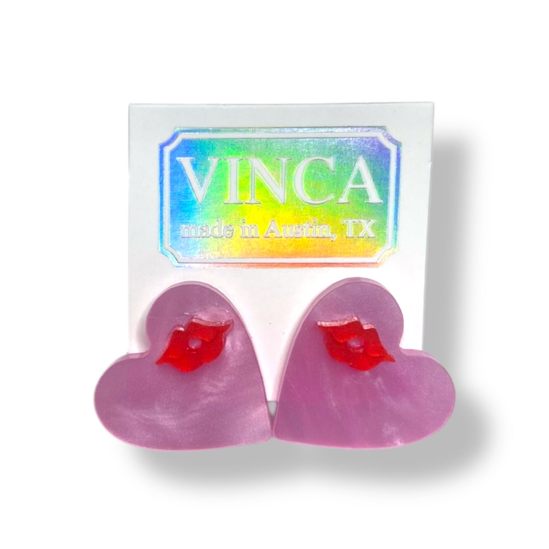 These earrings are anything, but plain, Jane. We cut pearl pink plastic hearts and frosted red plastic kissy lips to devise a pretty sweet stud earring. Hearts are about 1" wide and are attached to a surgical steel posts.