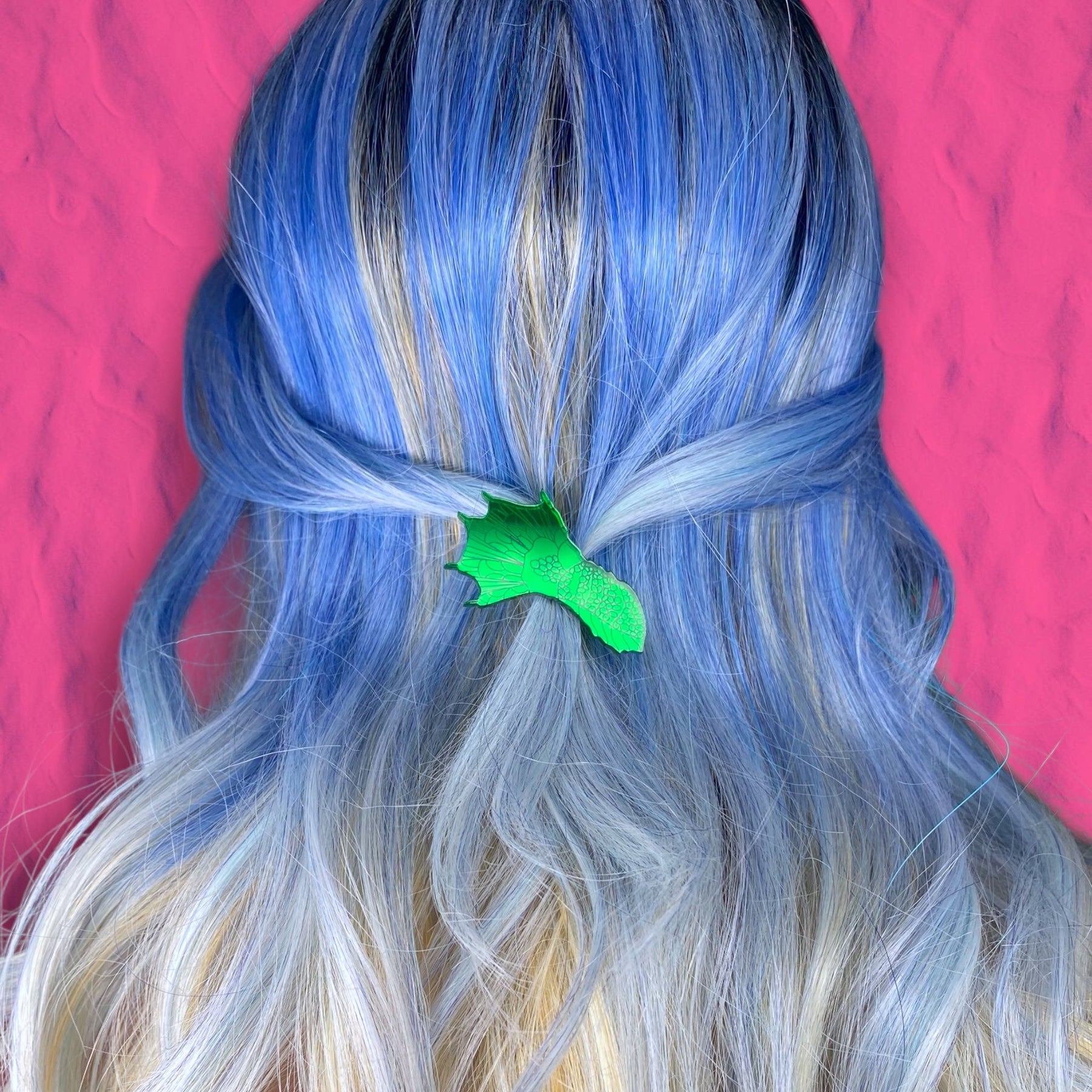 Our Swamp Monster Hand is made from super shiny green mirror acrylic and affixed to a Vinca branded alligator hairclip. Hair accessory is approximately 1.3" x 2.1".