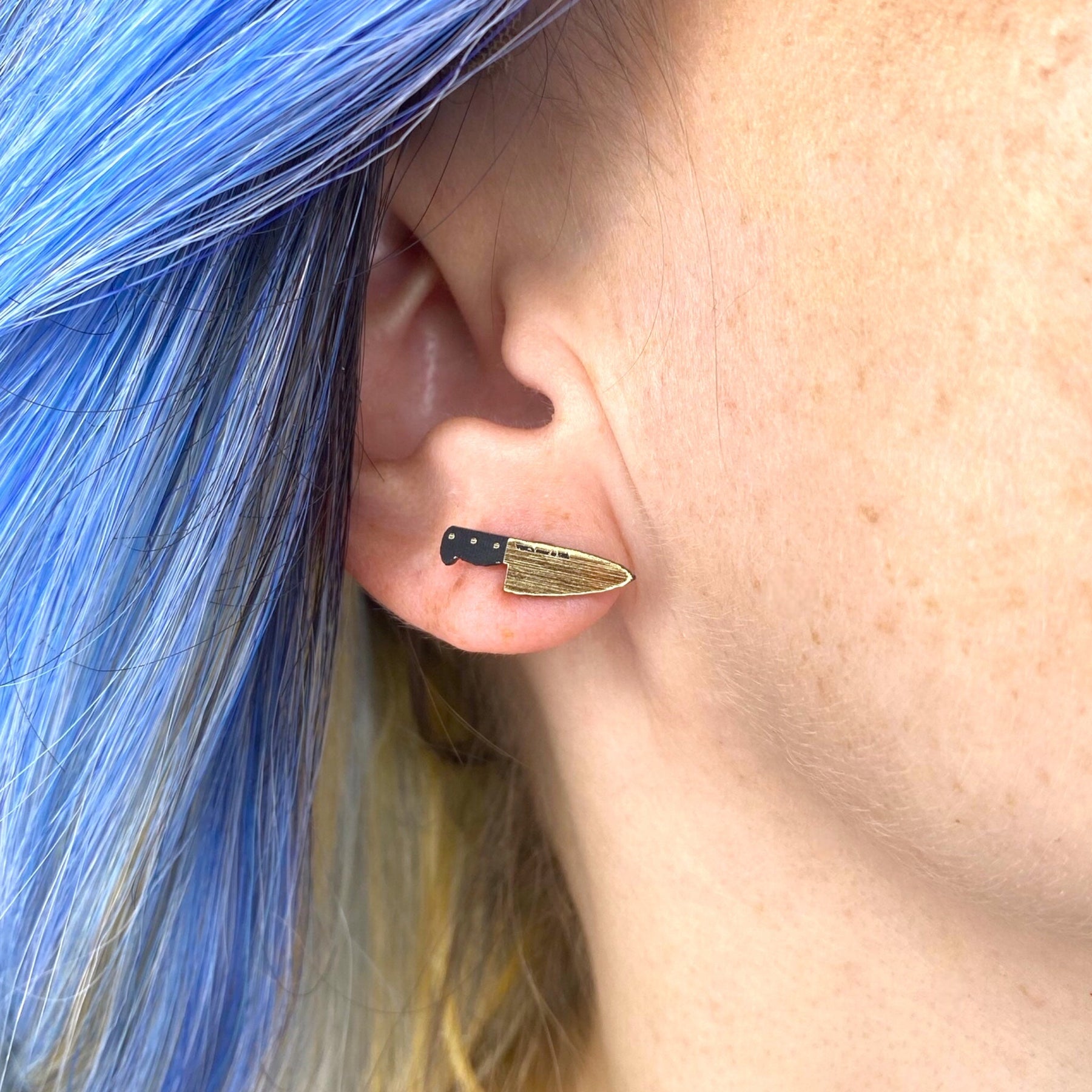 Want an edgy look that's still conservative enough to wear to the office? Try our .5" GOLD tone Teeny Tiny Chef's Knife Stud earrings on for size. These are our smallest Chef's Knife Earrings and they are mild enough to not frighten children.