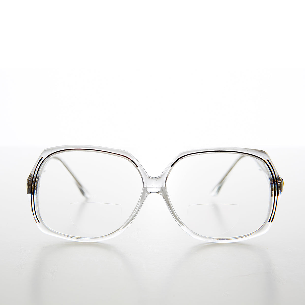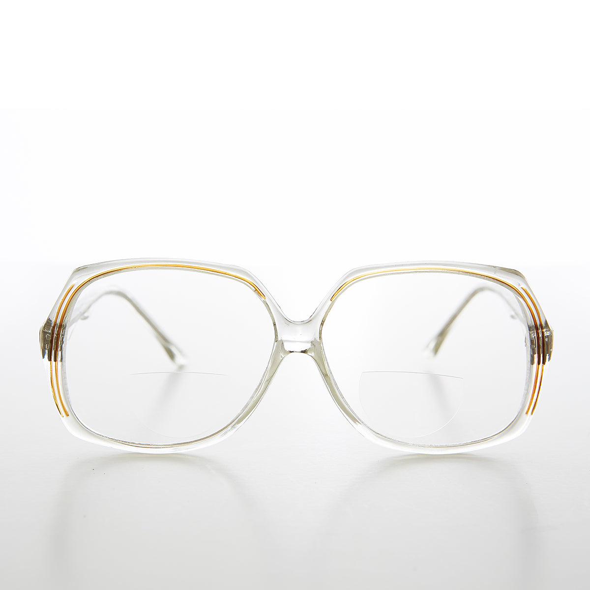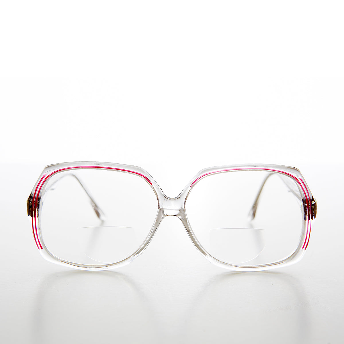 These oversized, old-fashion, granny glasses also include a bifocal, reading glass lens in a clear, plastic frame with color accents.
