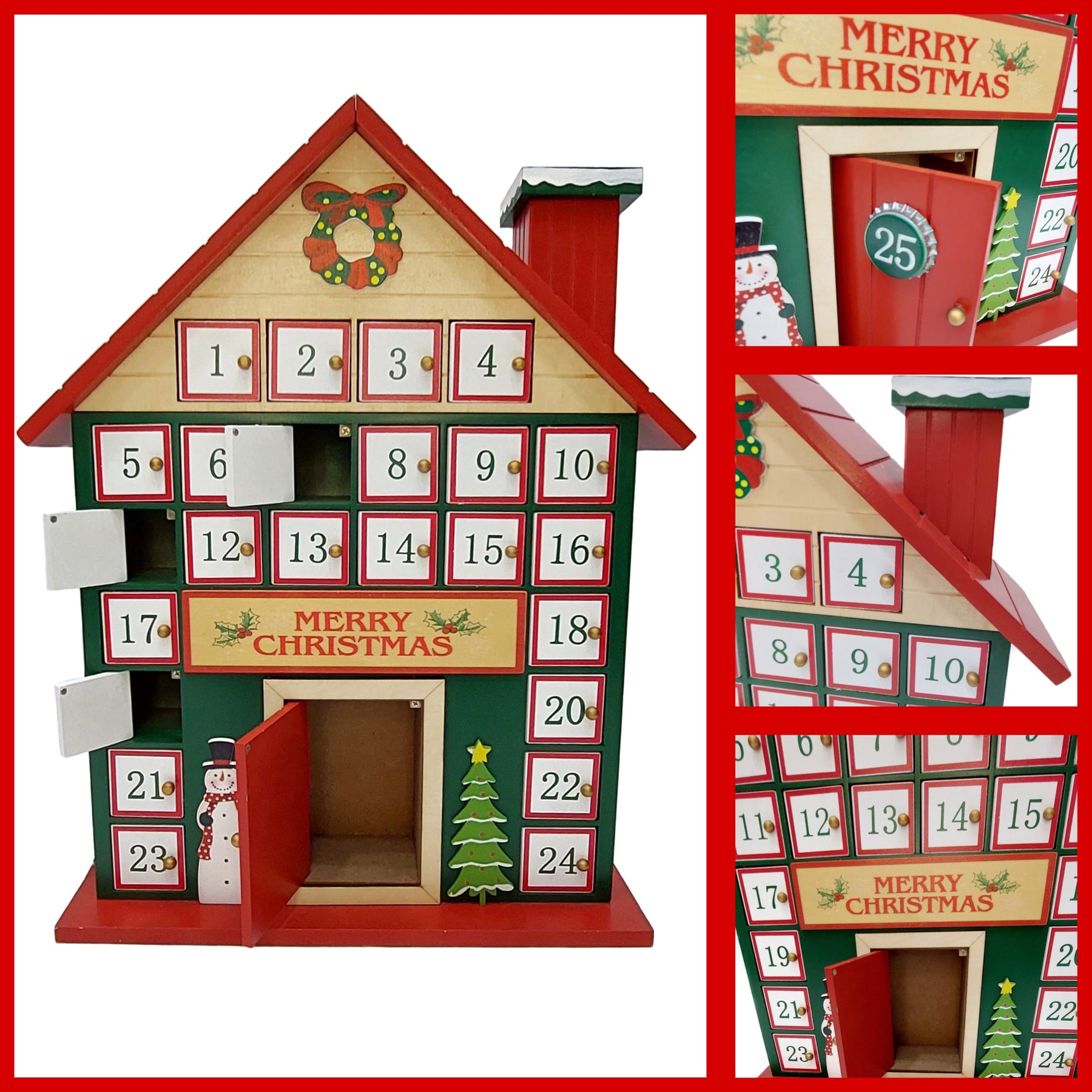 Add a cozy touch to your holiday countdown with this Christmas Cottage Wooden Advent Calendar. Shaped like a charming house, this advent calendar is beautifully detailed with festive accents like a snowman, a decorated Christmas tree, and a warm "Merry Christmas" greeting. Each of the numbered drawers is perfect for hiding small treats, notes, or surprises, helping to build excitement as Christmas Day approaches. Crafted from sturdy wood and painted in classic holiday colors, this calendar is a delightful and reusable decoration that will bring joy year after year.