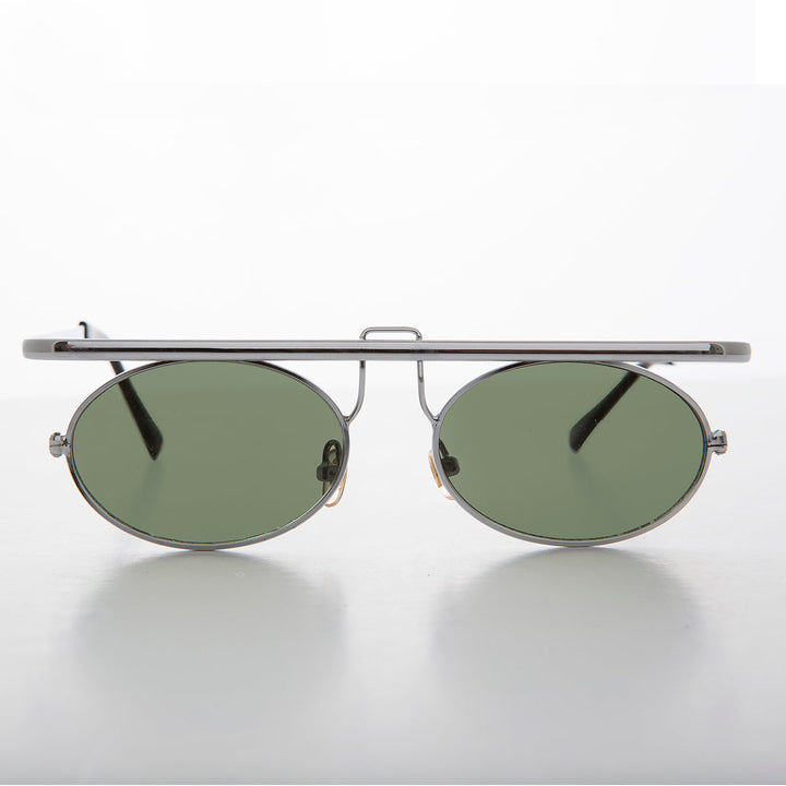 Very rare and unique oval metal sunglass that features a flat top one piece brow line. The bridge is attractively designed to rise slightly above the brow line adding, even more, pizazz to this unique sunglass. The frame is made from quality metal and is a prescription friendly.