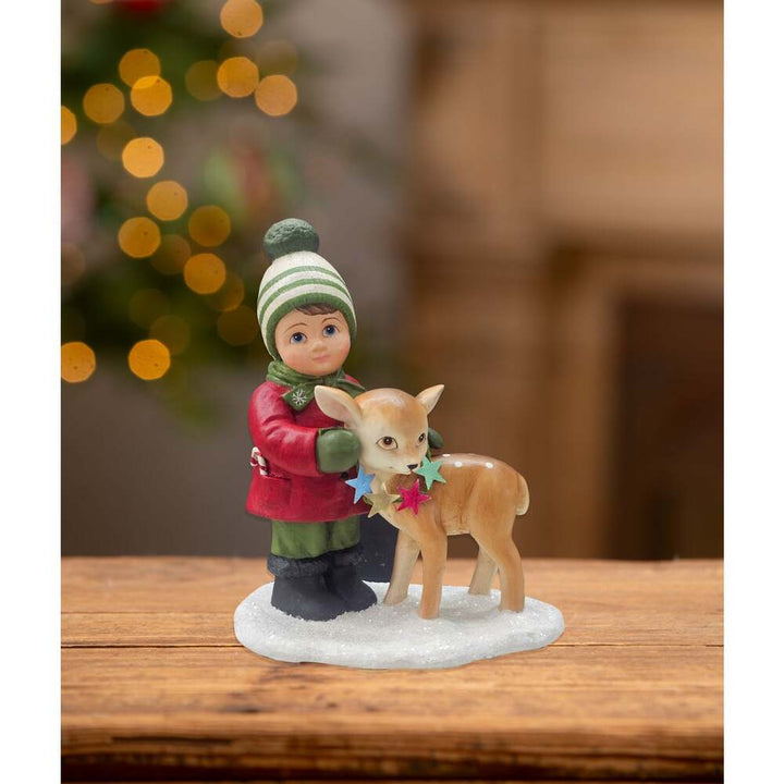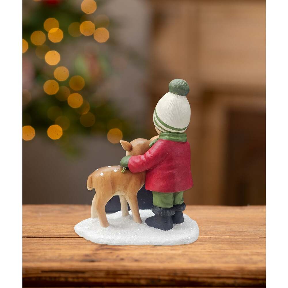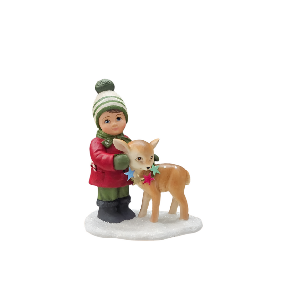 Danny and His Favorite Deer are ready for some wintertime fun in this charming holiday figurine! Bundled up in a cozy red coat, green pants and black boots, Danny is all set for adventure. He's carefully placing a garland of stars around his deer's neck, adding a festive touch to the moment. His green striped hat with a playful pom-pom completes his adorable winter ensemble. Hand-painted with intricate detail and a touch of glitter, this 6.25-inch figurine is a perfect addition to your collection of Christmas children, capturing the magic and warmth of the holiday season.