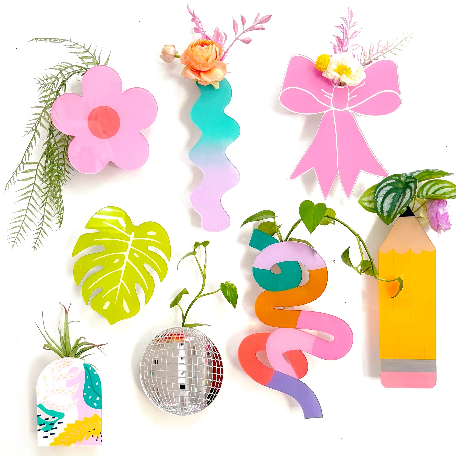 The cutest way to add a little bit of greenery or flowers to your wall. These little planters feature a test tube propagation planter behind a decorative be piece of acrylic. Use the included wall hook screw to attach them to the wall. Just screw in the hook and slip the test tube through the loop. Remove the test tube to fill with water for your plant cuttings. Works perfect as a mini bud vase for real or faux florals too! Each planter measures around 6“- 11” tall. Choose your shape.