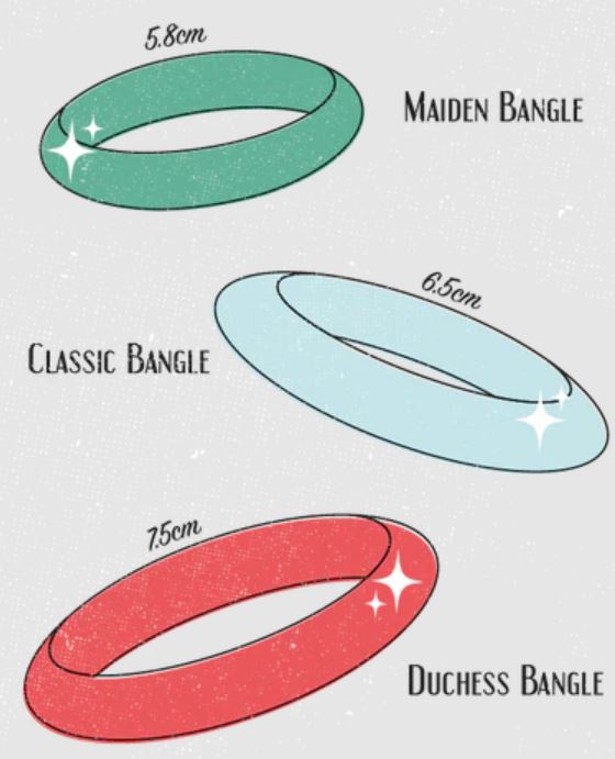 The Green Lagoon Glitter Bangle is available in all three sizes: smaller Maiden (5.8 cm), medium Classic (6.5 cm) and larger Duchess (7.5 cm). Still need some help with bangle sizing? We have a bangle size guide to lend a helping hand!