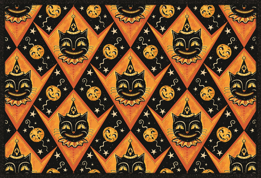 Add a touch of vintage whimsy to your space with our Grinning Black Cat Jack Harlequin Vinyl Floor Decor! Designed by Johanna Parker, this playful Halloween mat features a bold harlequin pattern and a cheeky black cat. Available in a range of sizes, including custom sizes upon request. Made to order and shipping in just 2 weeks. Measuring 38.5" x 56.5", it's purrfect for any room!
