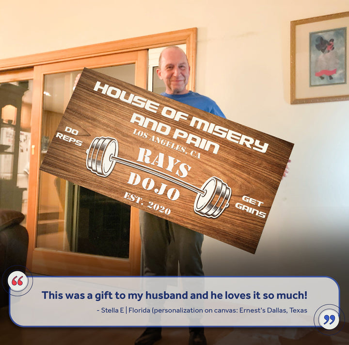 A gym sign is a great way to remind yourself to train harder and stay motivated when working the bars through pain and sweat. It can be a simple, one-line message or a more elaborate design. Gym signs are usually made of durable materials like our high quality canvas, so they can withstand the rigors of an intense workout.