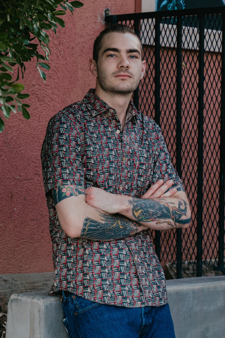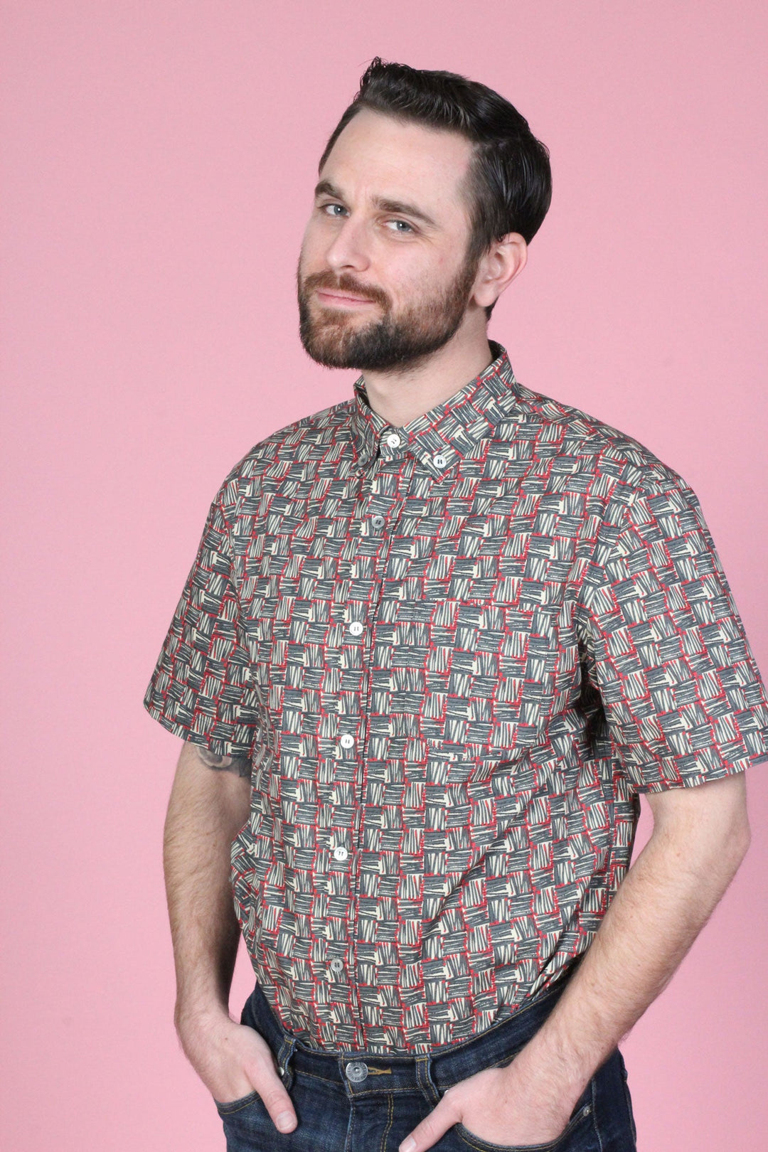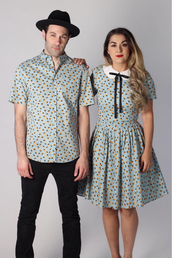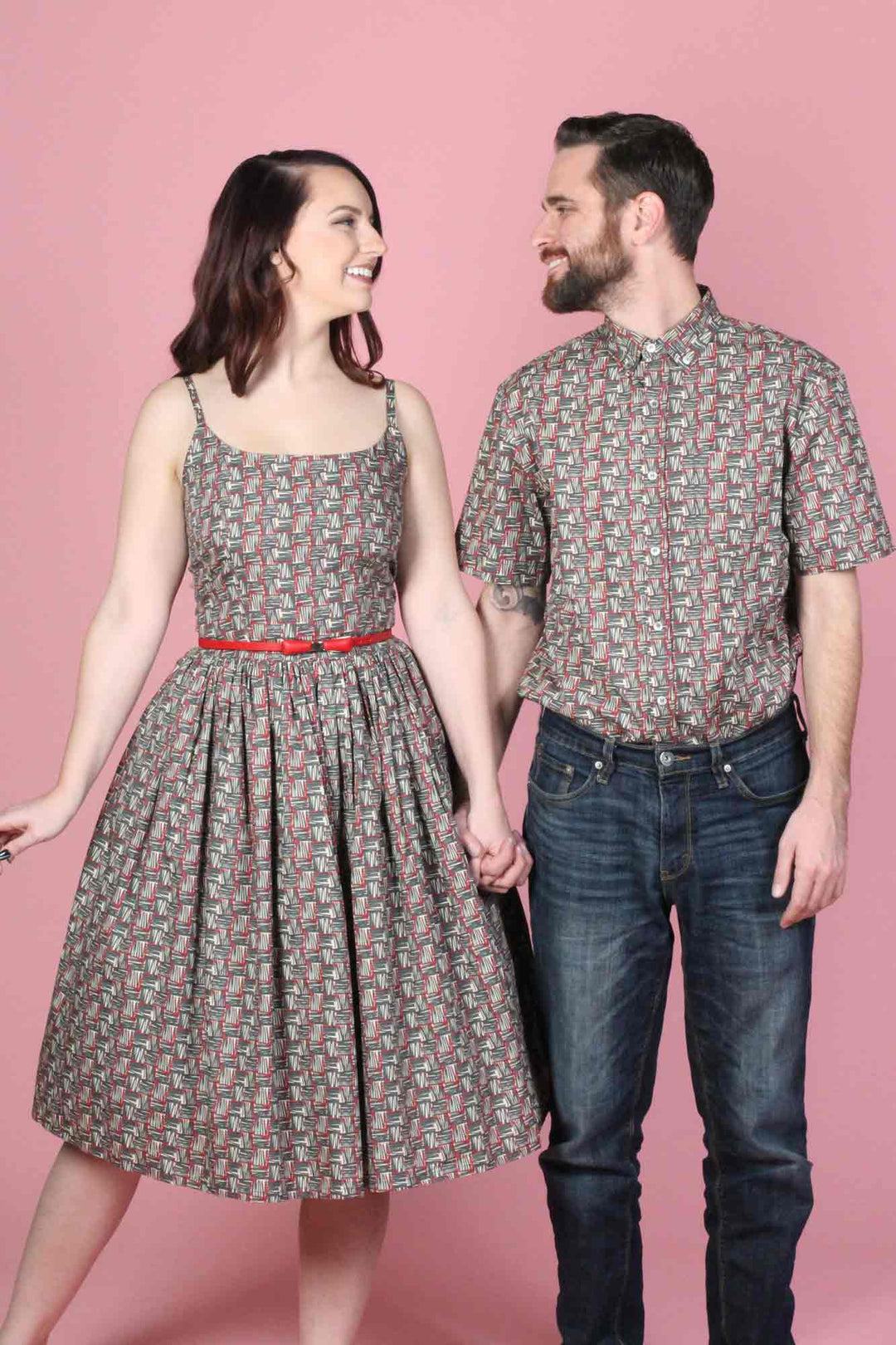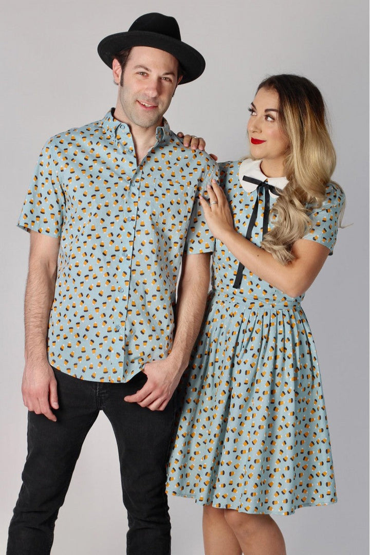Just in time for all the tiki pool parties! The Harvey Men's button-up shirt is a lightweight cotton novelty print that matches perfectly with our Saundra dress in matchstick.