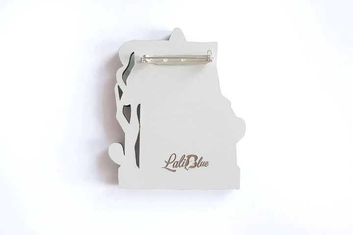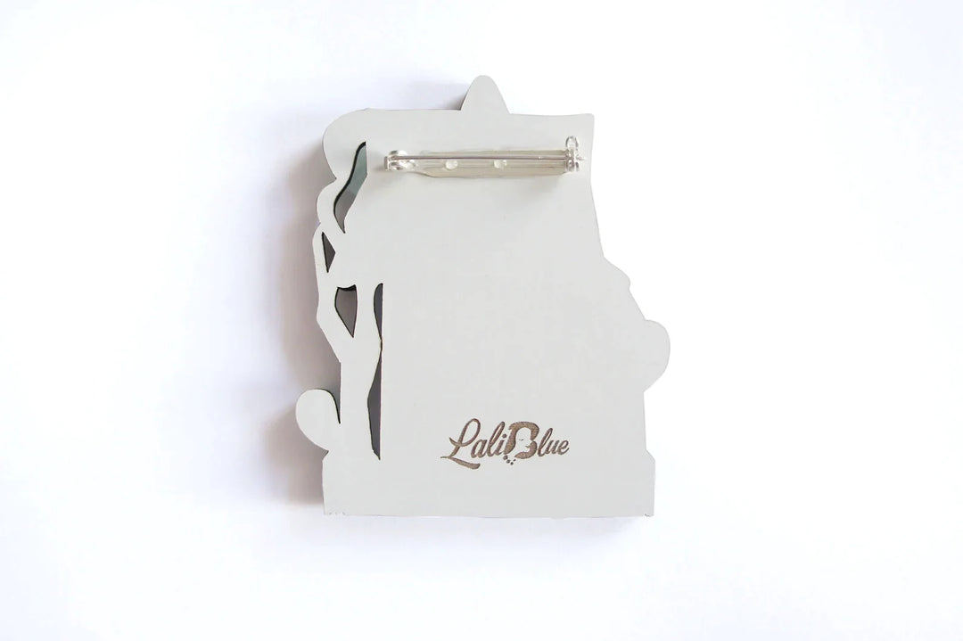7.5 x 6 cm brooch, made of illustrated wood with a gloss finish, luminescent acrylic and tiny beads.