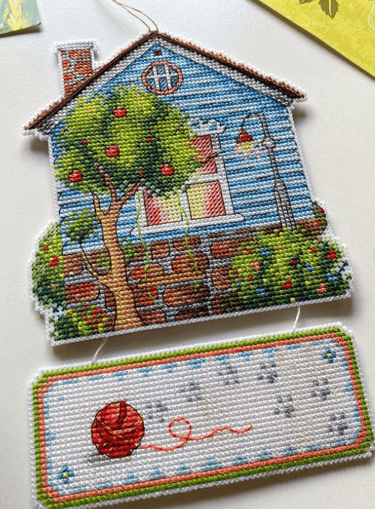 MP Studia counted cross-stitch set. This kit is stitched on the both sides with threads. Cross-Stitch base is plastic canvas. Cotton threads. It is new, unopened kit. Makes blue house on plastic with 2 sides.