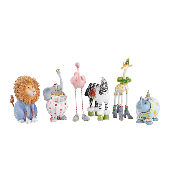 Dimensions: Set includes: 1 Janet Giraffe Mini Ornament (4.5” tall), 1 Zelda Zebra Mini Ornament (3.5” tall), 1 Richard Lion Heart Mini Ornament (3.5” tall), 1 Eleanor Elephant Mini Ornament (4” tall), 1 Sheldon Flamingo Mini Ornament (4.5” tall) and 1 Roberta Rhino Mini Ornament (2.5” tall).