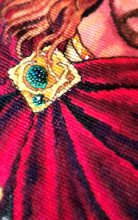 Kit contains: Linen 32 cts belfast vintage country, beads, 4 metallic threads (2 Cocon Caudry+2 Tonkin) Ets Toulemonde, 9 sachets of beads, 1 mohair thread, 2 needles (embroidery + beads), 1 mohair thhread. Dimensions: 41x32cm / 16,14x12,6in