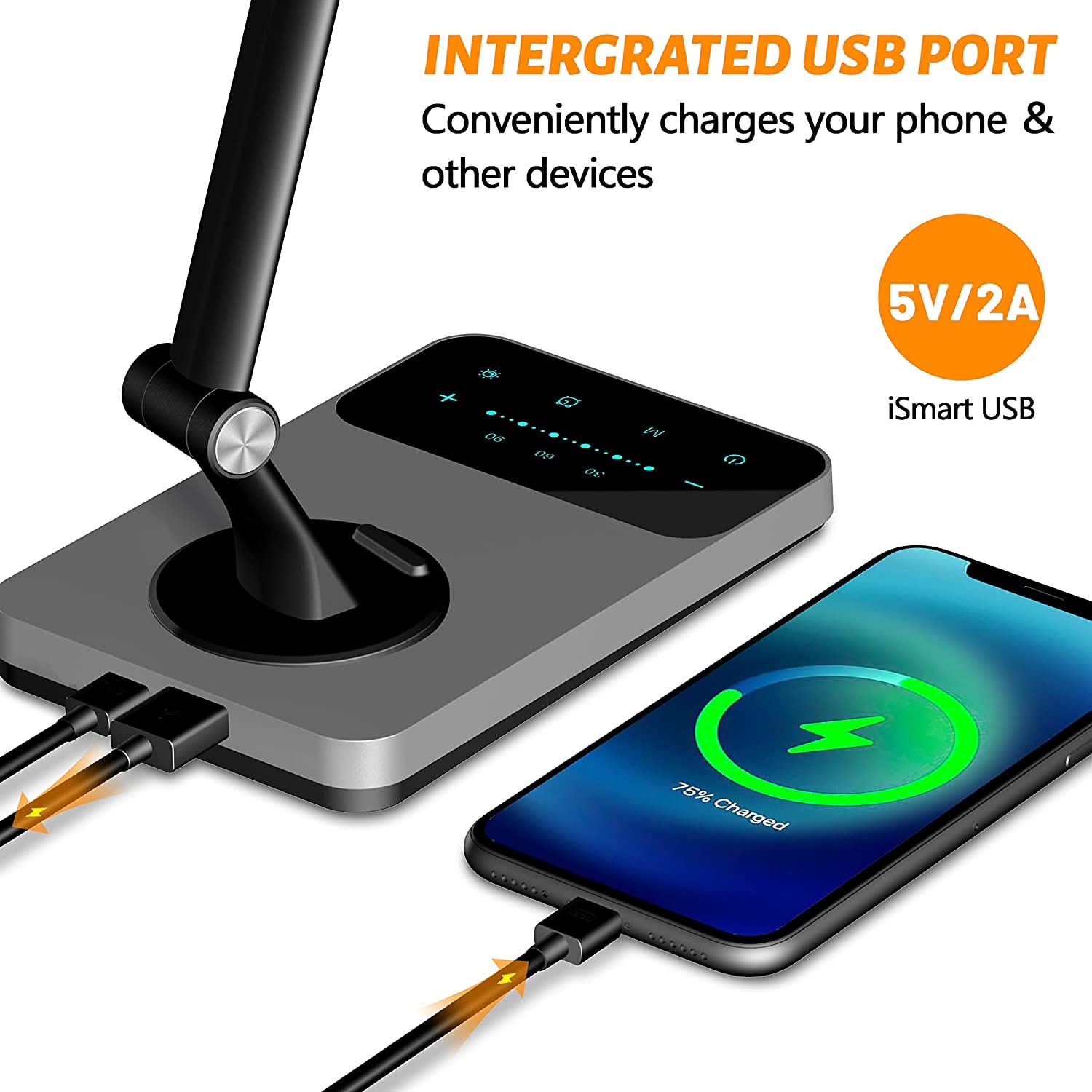 Soft light desk lamp With 5 lighting color temperatures & 6 brightness levels, 30 lighting modes in total.Various Lighting Modes enabling you to customize your desired light for work, study, reading, or relaxing, create the perfect ambience.Our Desk lamp with USB charging port has energy-saving full-spectrum LED beads with soft eye protection features to relieve eye fatigue, no flicker, no shadow characteristics, meeting your needs in different environments.