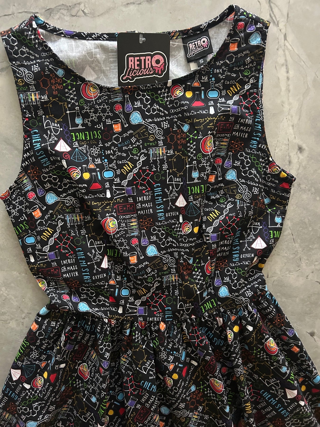 A vintage style piece with fun, modern details; our midi dress is now available in our Science print.  Made from 100% cotton, this classic 1950's inspired dress features a high neckline, longer length swing skirt with hidden side pockets, and back zippered closure.