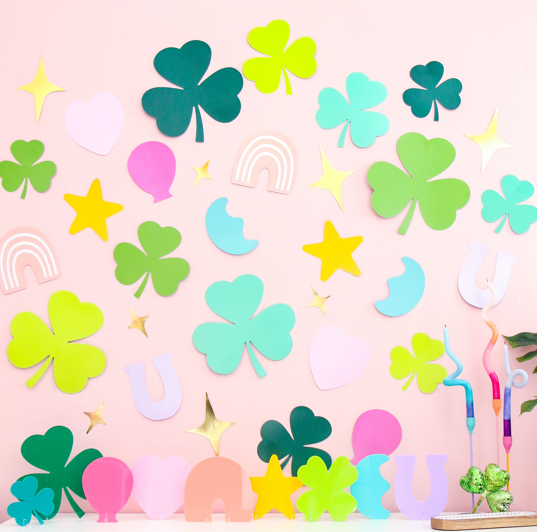 Set of over 30 pieces of giant confetti that measures 6" - 12". Shamrocks, lucky charms, and gold sparkles.