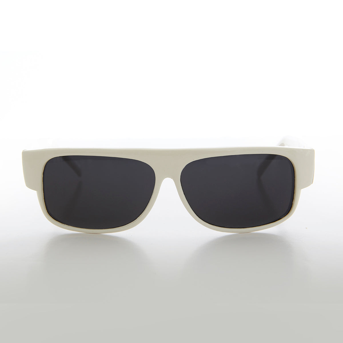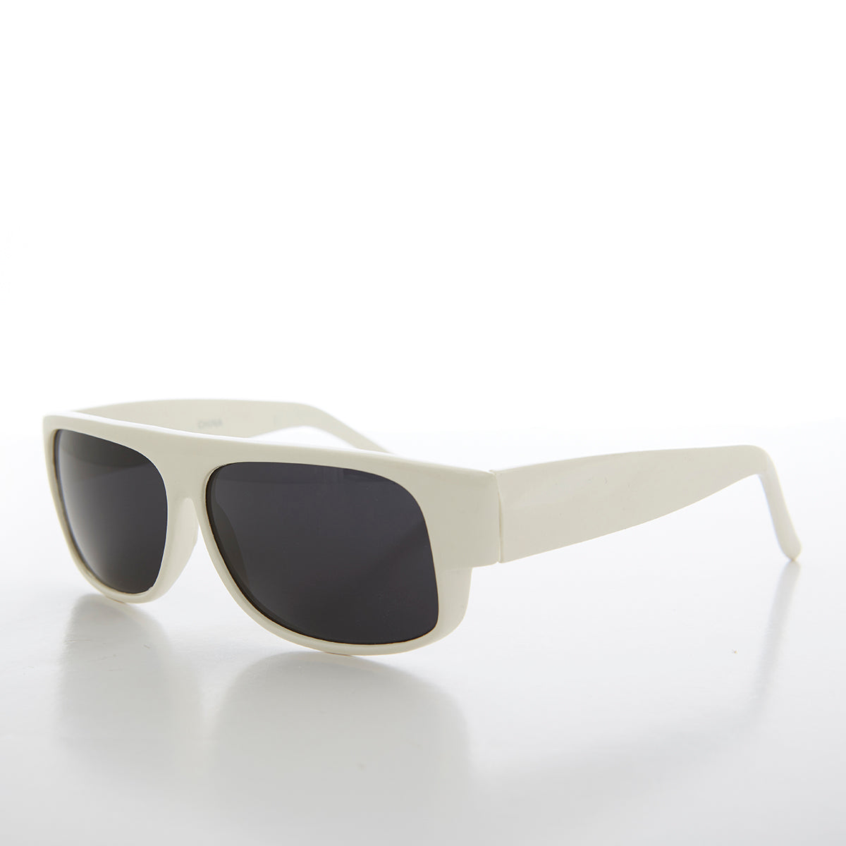 Super popular in the 80s this sunglass features a rectangular white frame with dark gray lens. Plastic frame with metal hinges. New old stock. Never worn. Great condition. UV Protection.