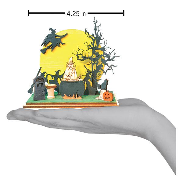 Light the Witches Convention at your own risk! With a small hole on its underside designed to borrow a standard bulb from your Christmas tree your cottage will light up. Upon lighting your cottage, you will immediately discover the first of many secrets, the spook-tacularly crafted scene inside. Looks like the witches brought a long a friend or two; can you find the ghost and two cats? How many witches can you find in attendance at this convention?