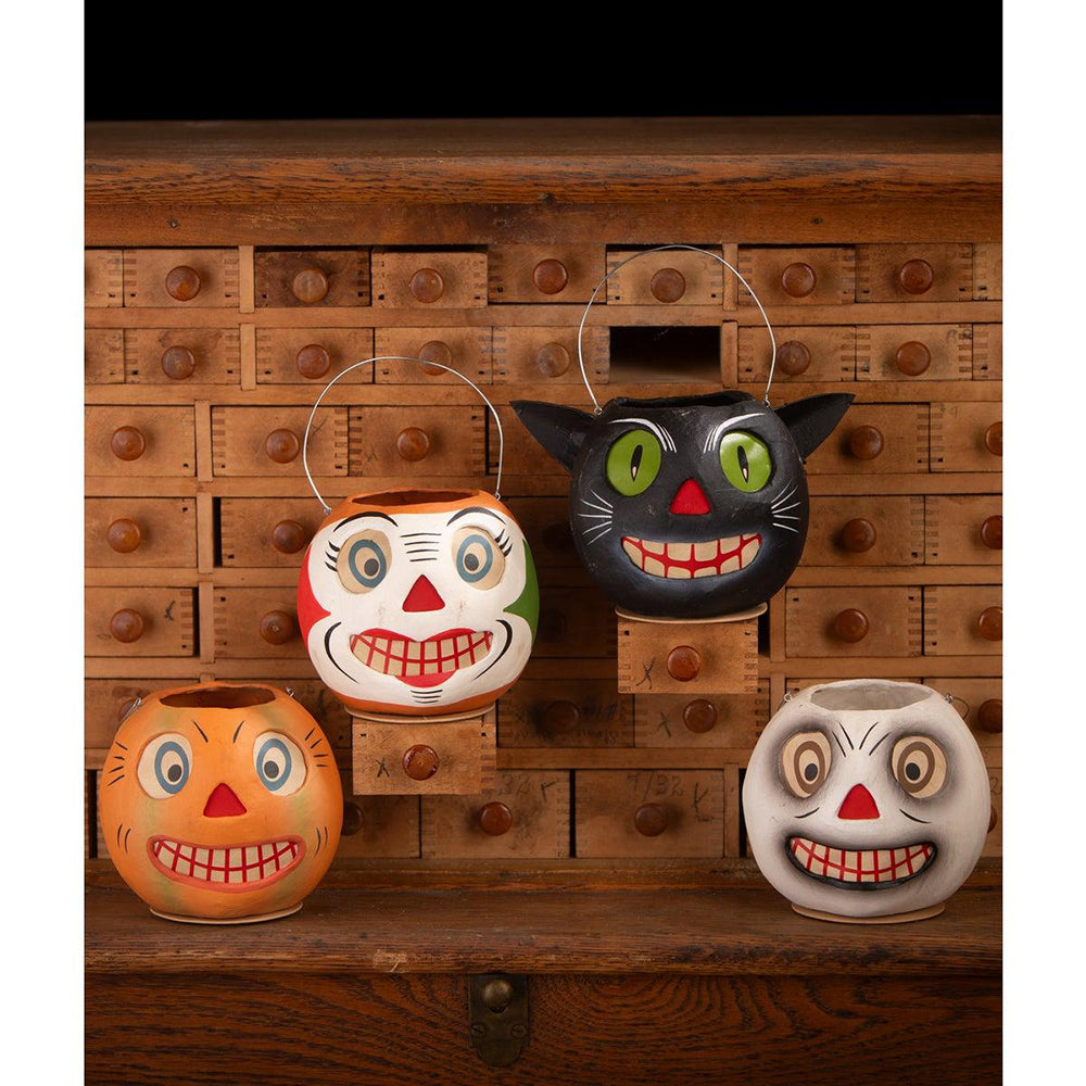Celebrate the spirit of Halloween with our Vintage Striped Pumpkin Bucket! This delightful reproduction is thoughtfully designed to capture the essence of the original piece, bringing a nostalgic touch to your Halloween decor. Crafted from durable paper mache, this enchanting bucket features eye-catching striped patterns that are perfect for adding a playful vibe to your festivities. With paper inserts that allow you to fill it with a warm light or sweet treats, this Vintage Striped Pumpkin Bucket is a charming addition to any Halloween display, sure to delight both young and old! This piece is carefully antiqued and distressed by hand to give it a unique, vintage look. Each one is truly one of a kind, with slight variations that add to its charm and character. Light not included.