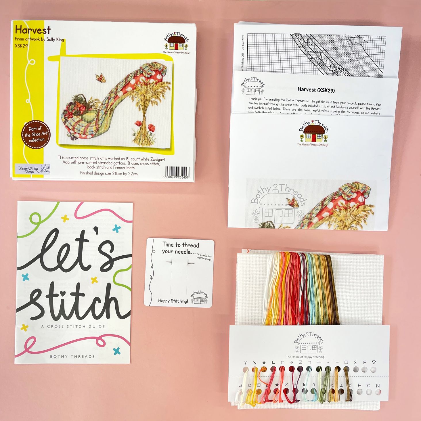 This counted cross stitch kit is worked on 14 count white Zweigart Aida with pre-sorted stranded cottons. It uses cross stitch, back stitch and French knots.