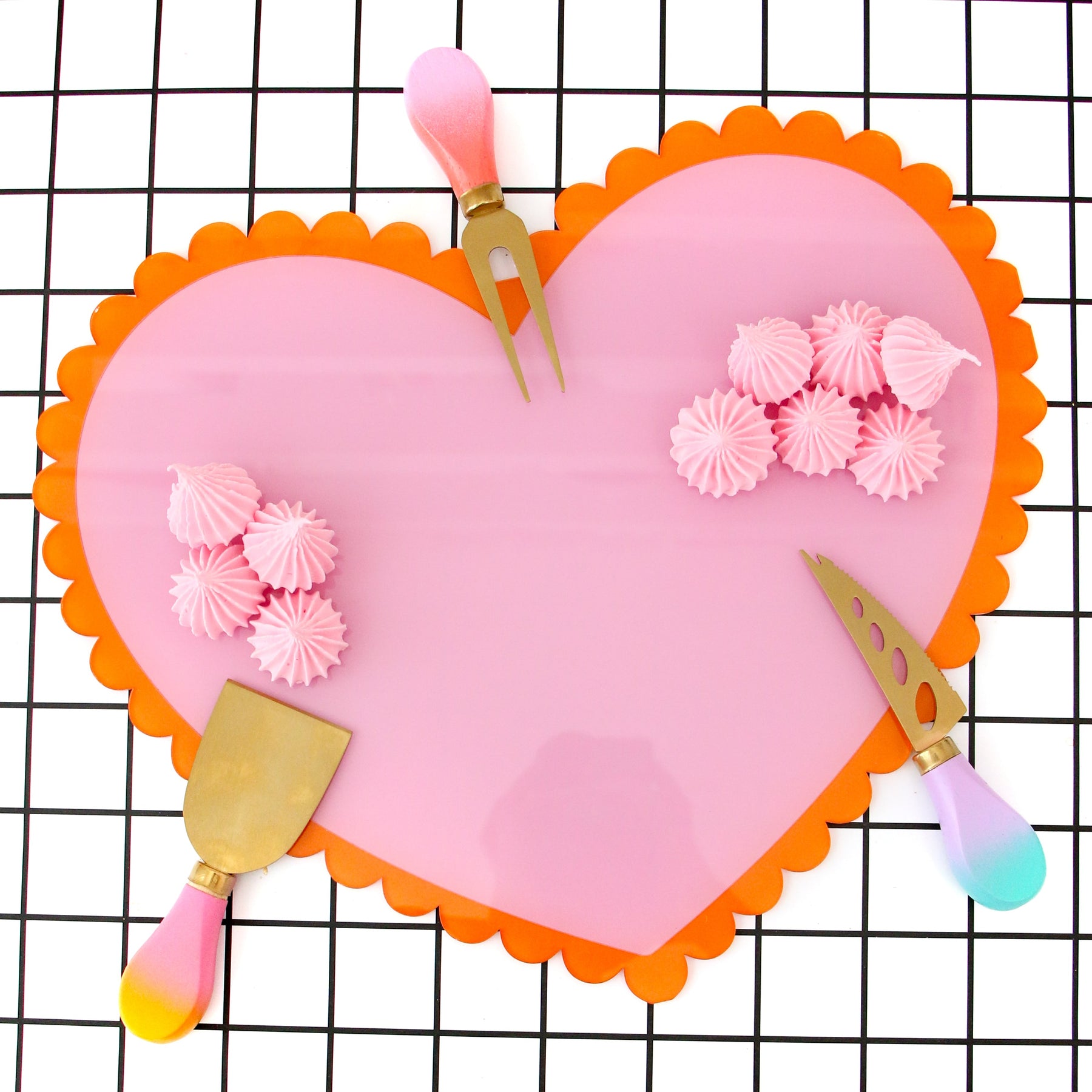 Acrylic scalloped heart acrylic tray. Measures 12" by 14". Use for serving treats, as coffee table trays, or propped up on your shelf.