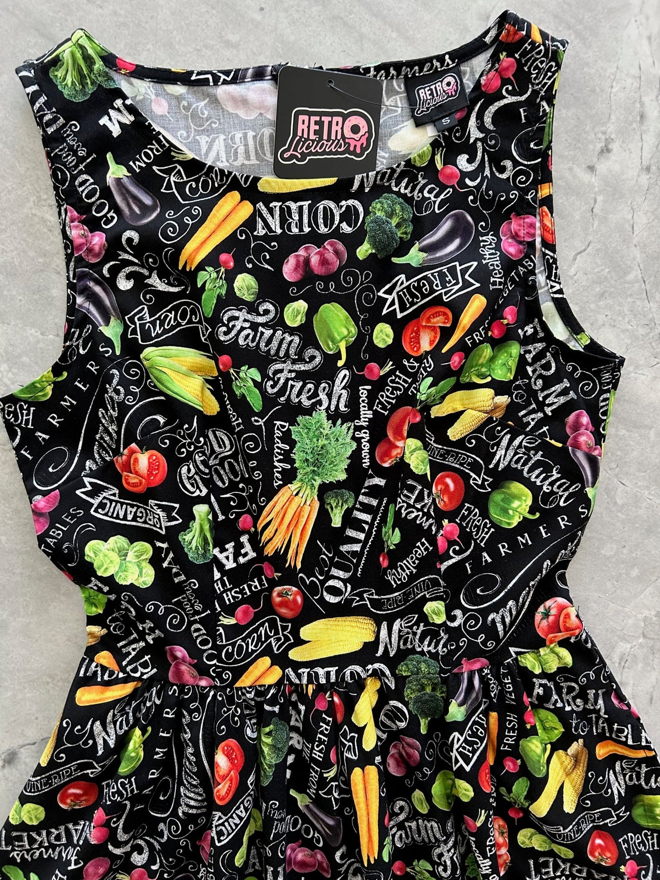 Introducing our Farm Fresh Vintage Dress, a delightful blend of retro charm and whimsical allure. This unique dress is designed to transport you to the idyllic charm of a vintage farm, celebrating the beauty of nature's bounty with a playful twist. Adorned with an enchanting print of vibrant vegetables, this dress is a true testament to the joy of farm-to-fashion style.