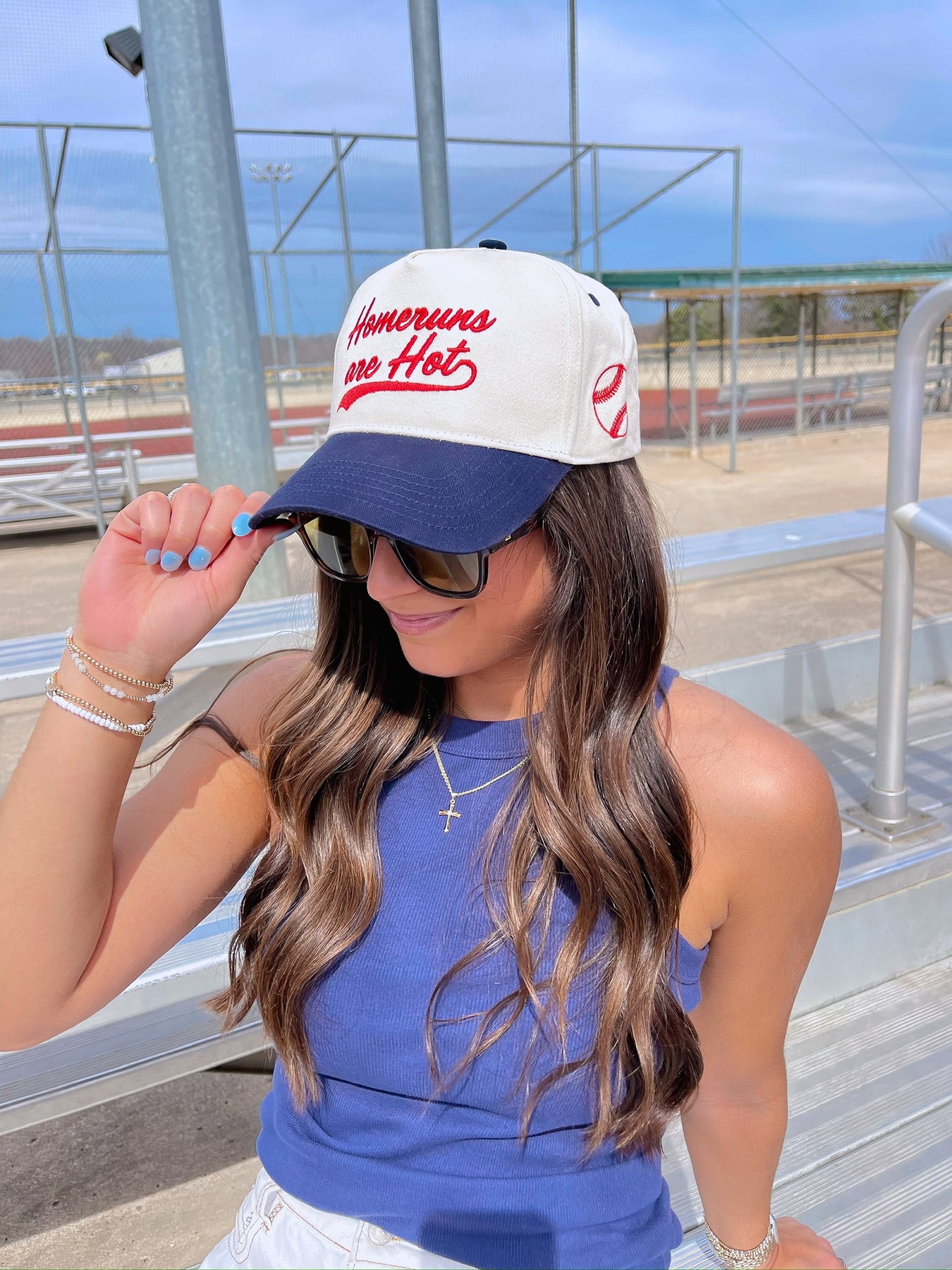 - Navy vintage trucker hat, with side embroidery and adjustable snapback