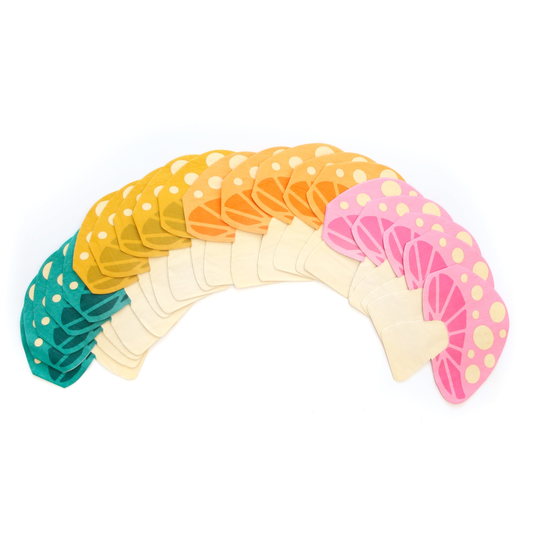 20 paper mushroom napkins in pink, peach, mustard, and teal.