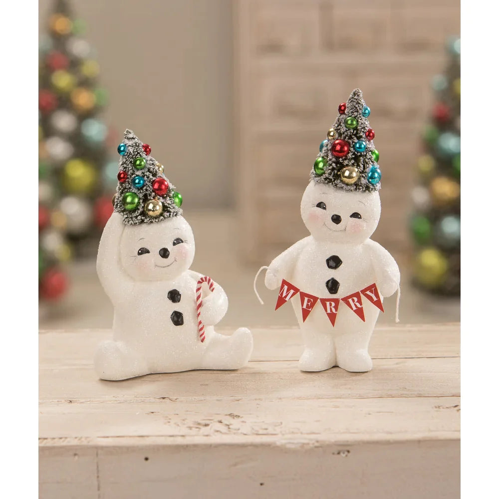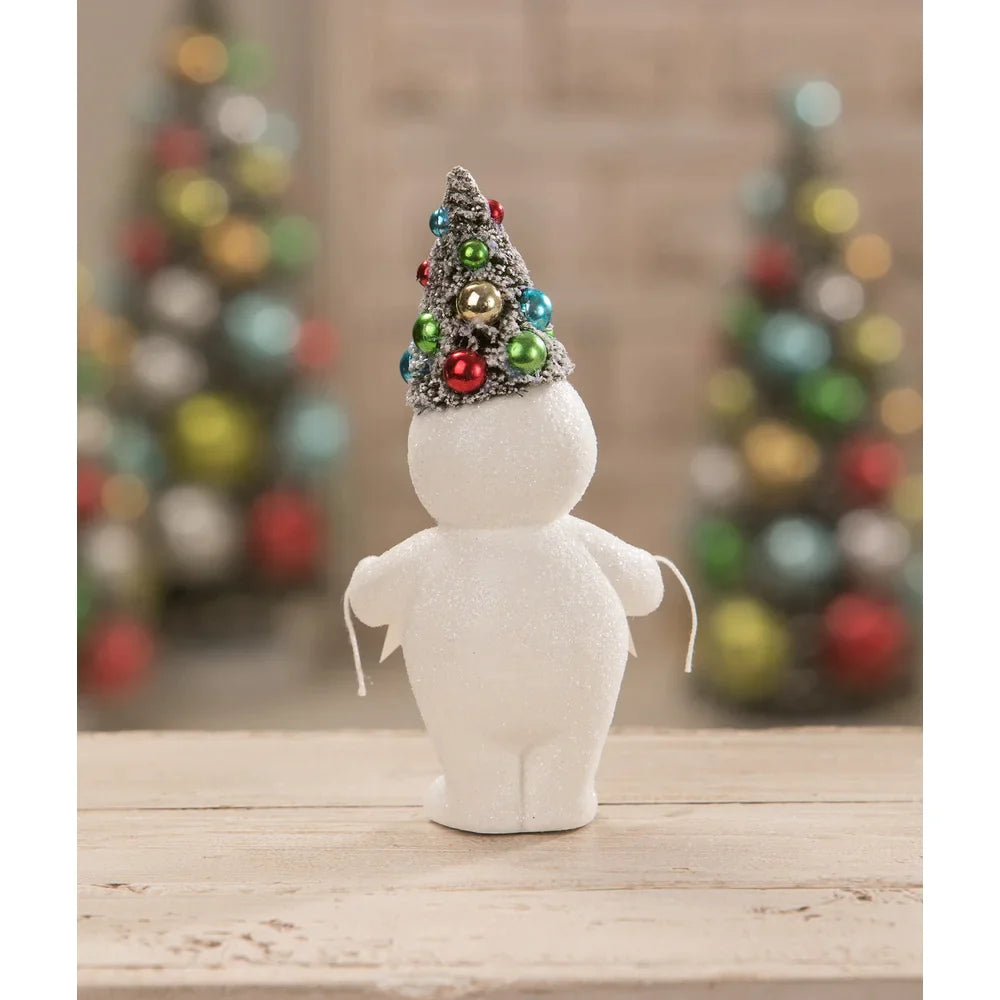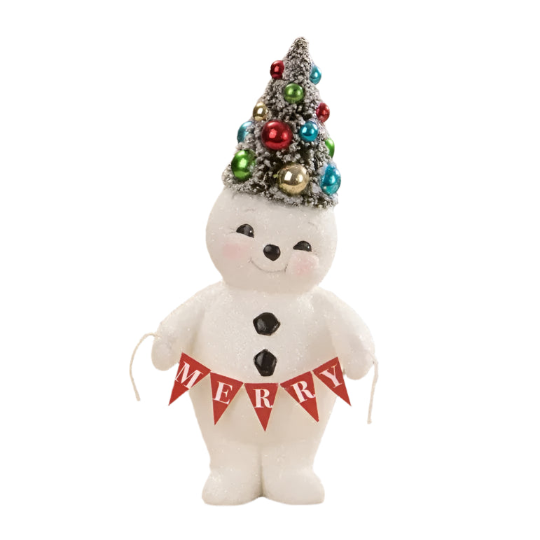 Capture the spirit of the season with this charming retro snowman. Crafted from hand-painted resin, glitter, and bottle brush, it stands 3" x 2" x 7" tall and adds a joyful touch to any holiday display. Perfect for fans of the Bethany Lowe Christmas Collection!