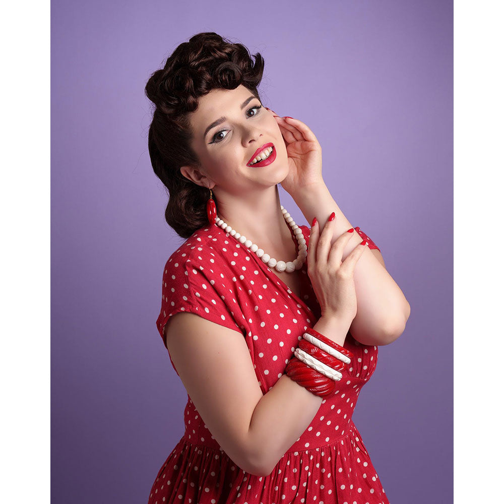 Red is one of the biggest and boldest colours you can add to your vintage inspired wardrobe. Whether you're a 1940s siren, a 1950s bombshell or you just want to add some va-va-voom to your outfit, the Narrow Red Heavy Carve Fakelite Bangle is the piece for you!