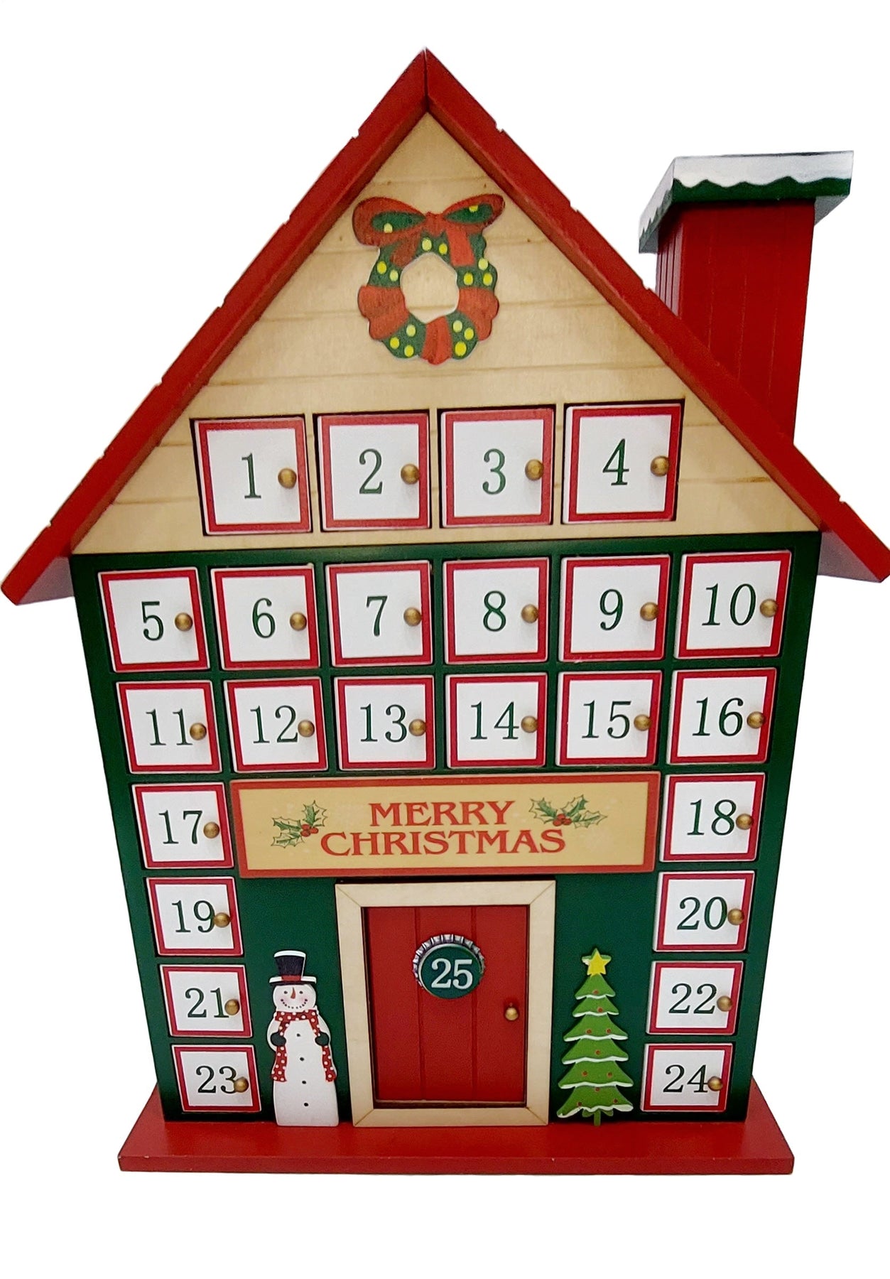 Add a cozy touch to your holiday countdown with this Christmas Cottage Wooden Advent Calendar. Shaped like a charming house, this advent calendar is beautifully detailed with festive accents like a snowman, a decorated Christmas tree, and a warm "Merry Christmas" greeting. Each of the numbered drawers is perfect for hiding small treats, notes, or surprises, helping to build excitement as Christmas Day approaches. Crafted from sturdy wood and painted in classic holiday colors, this calendar is a delightful and reusable decoration that will bring joy year after year.
