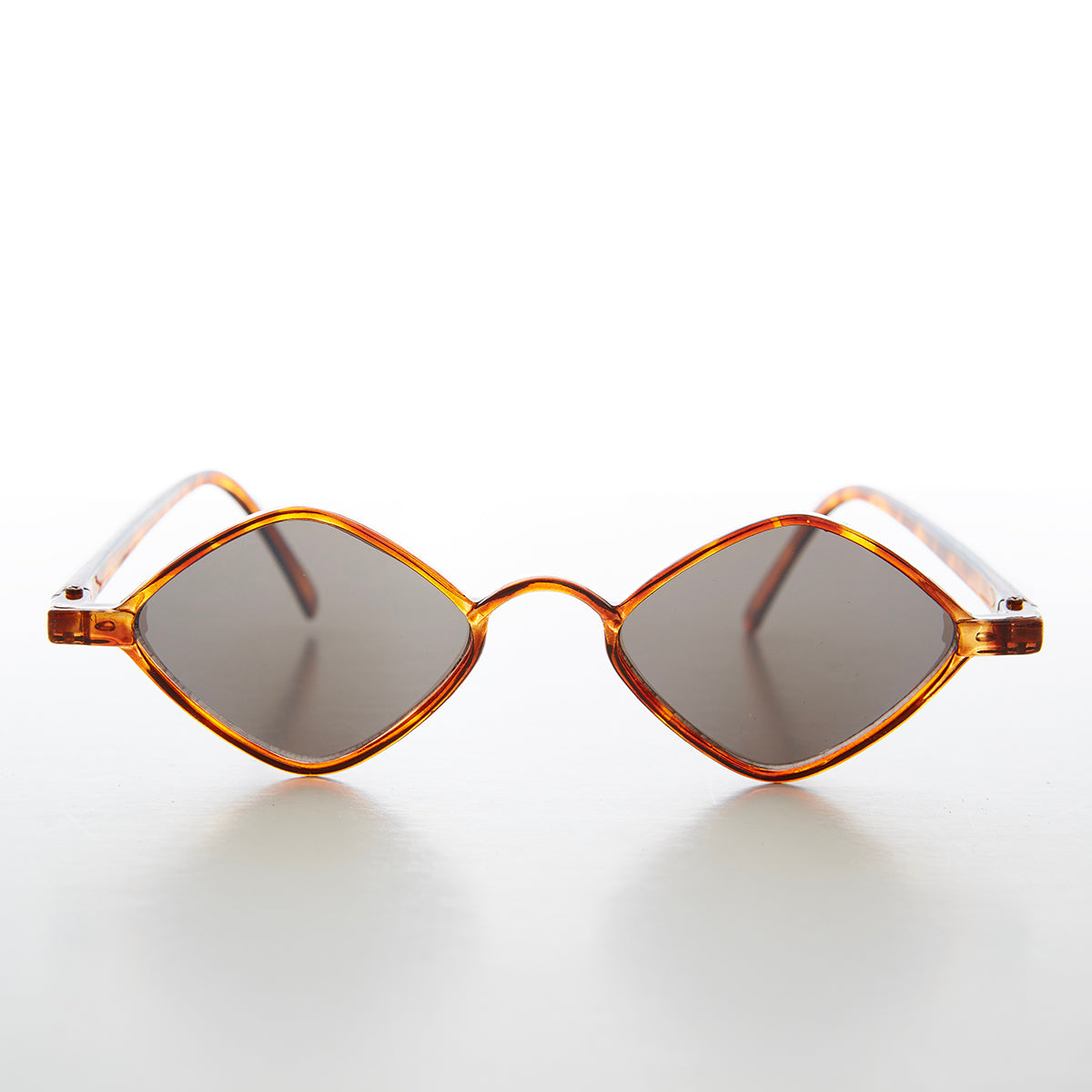 This fun novelty sunglass features a diamond shaped frame with a mirror lens. New old stock. Never worn. Great condition. UV protection.
