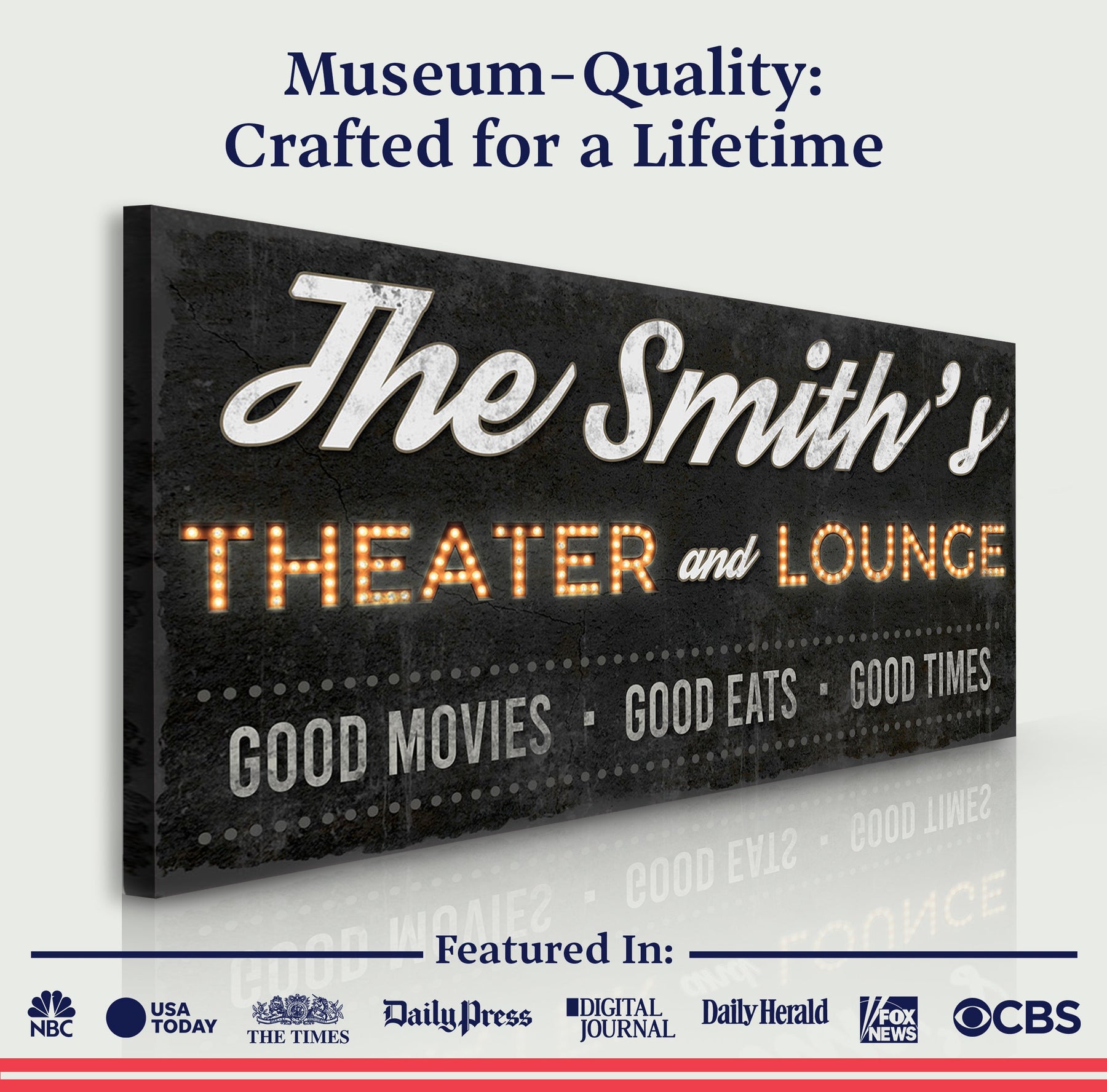 Dress up your home theater and lounge with this personalized Family Theater and Lounge sign. This cheerful and stylish sign is perfect for personalizing your family theater or lounge. It's a great way to add some personality and flair to your space. Plus, it makes a great conversation starter for your guests.