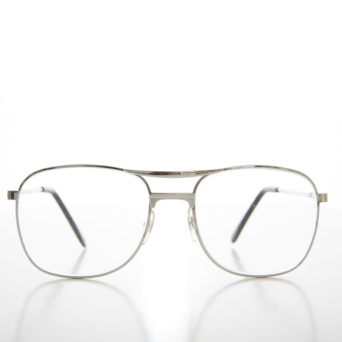 These 80s reading glasses feature a metal square aviator shape frame with a full reading glass lens. New old stock. Never worn. Great condition.