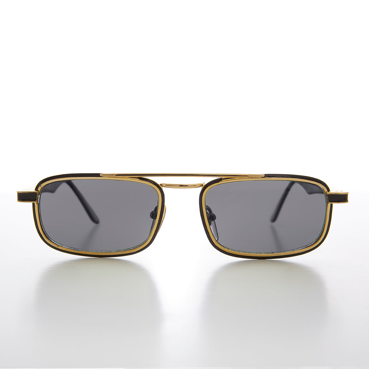 This aviator features a distinctive two tone rectangular gold rimmed frame. A stand out sunglass that will make a wonderful addition to your unique eyewear collection. Optical quality prescription friendly frame. New old stock. Never worn. Great condition. UV protection.