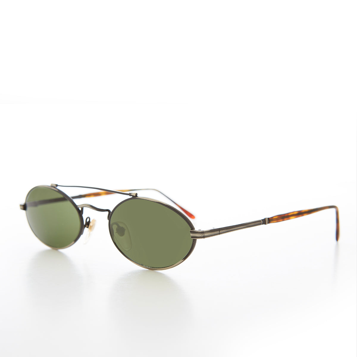 This sleek and streamlined sunglass features an oval frame and brow bar and acetate/metal combination temples. This frame is prescription friendly too. New old stock. Never worn. Great condition. UV protection.