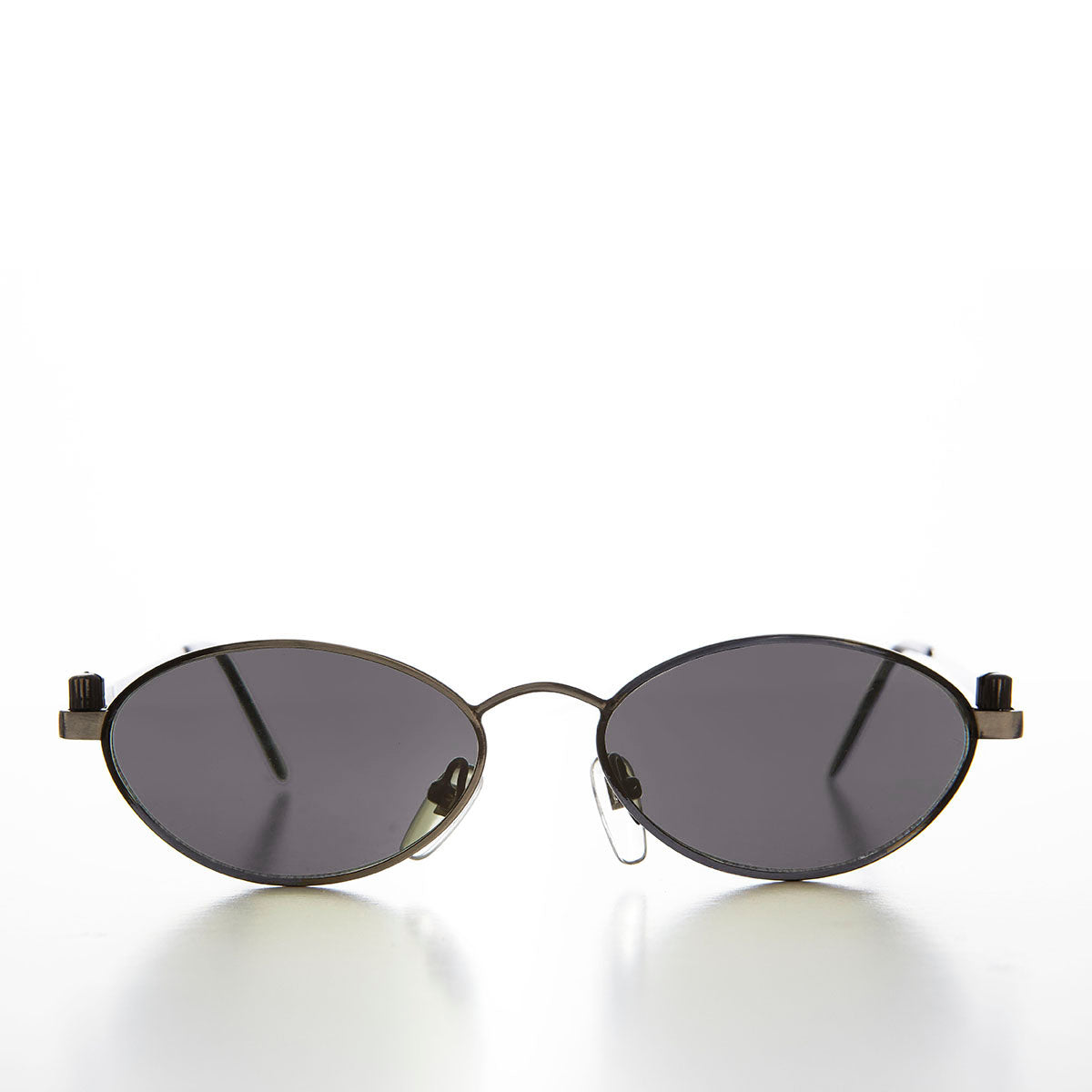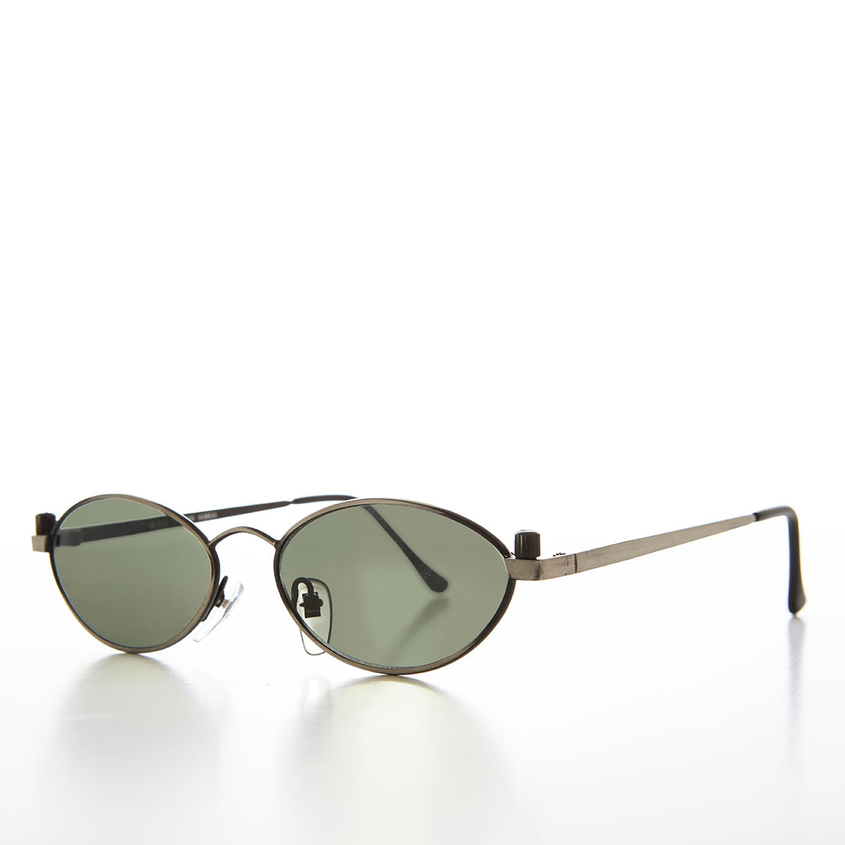 This great sunglass features a more unique, slimmer, oval shaped lens accented with a grip-screws. Make a bold statement in this one of a kind sunglass. Optical quality frame. New old stock. Never worn. Great condition. UV Protection.