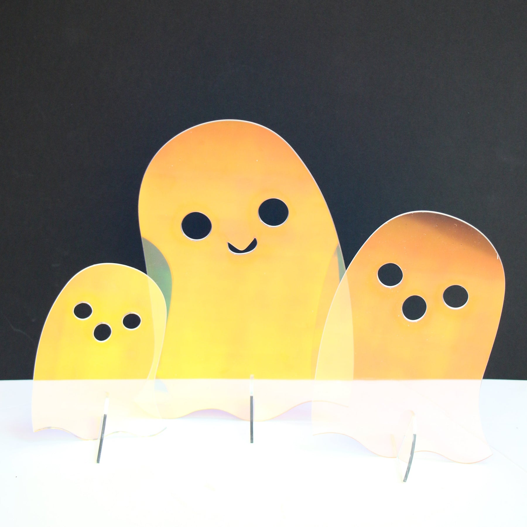 Each set comes with 3 ghosts in 10", 8", and 6" tall. Comes with stand. Iridescent changes color depending on the color of the surface it is reflecting.