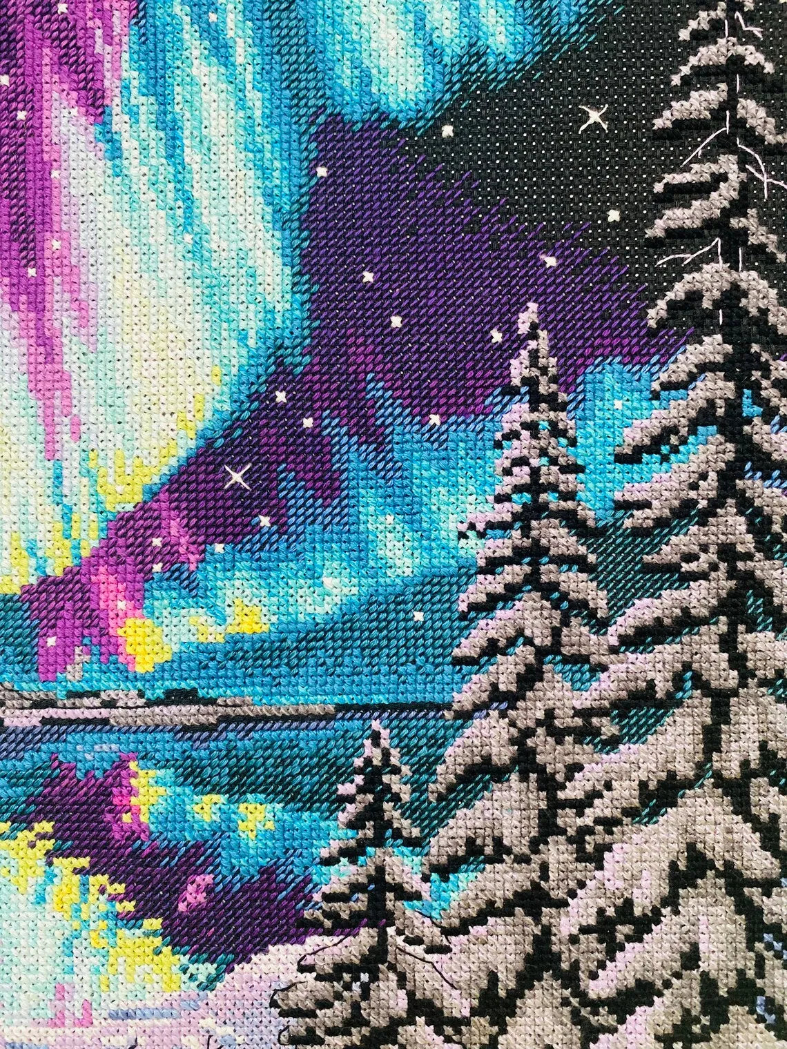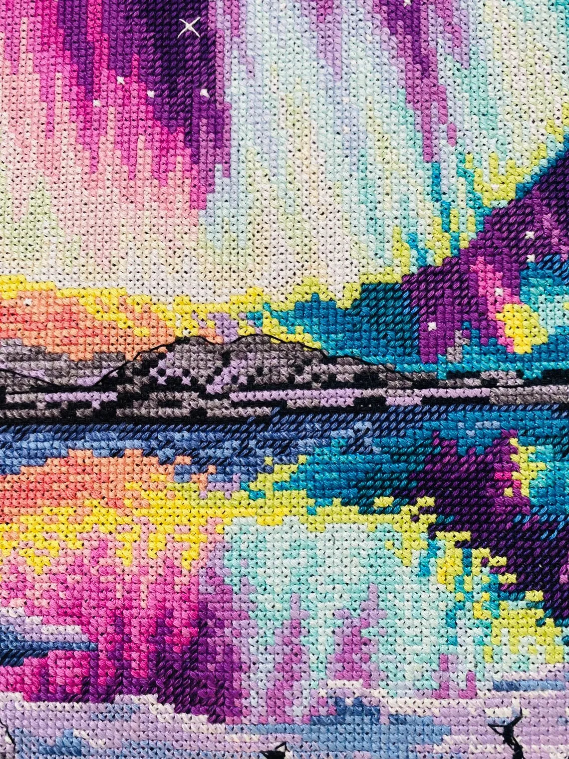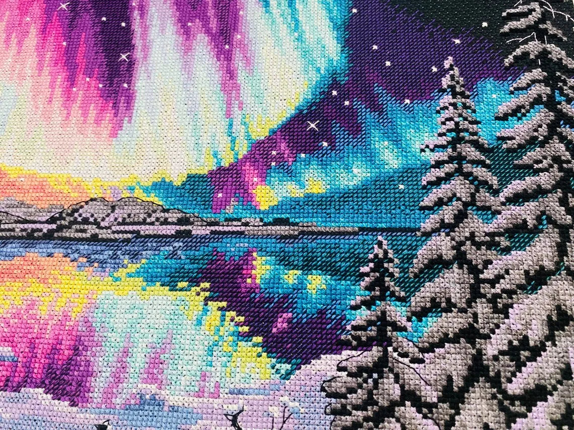 Kit contains: Canvas Zweigart 14ct. black AIDA, treads: Anchor stranded cotton 29 colors. Instruction, color chart, needle 1 type. Dimensions 40*30cm/15¾" x 11¾"inches.