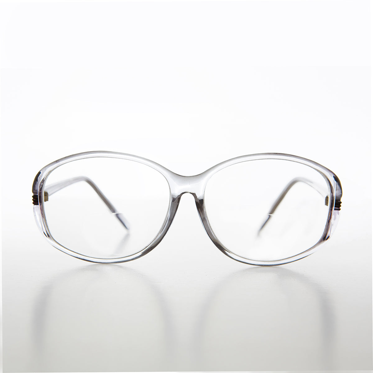 This reading glass features a roomy round lens inside a cute clear frame with brown accents.