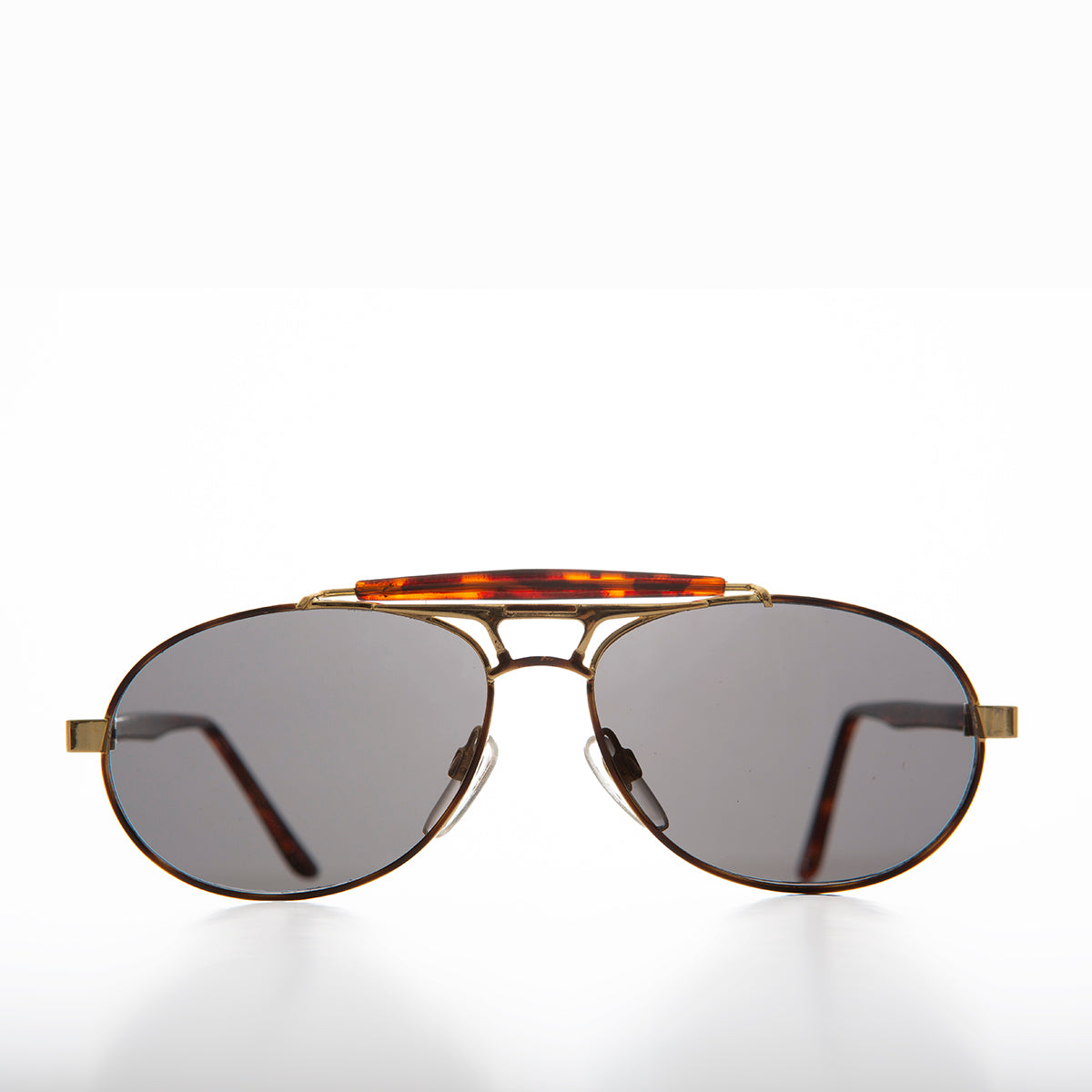 This unique 90s pilot sunglass features and oval shaped metal rim with matching plastic temples and brow bar. New old stock. never worn. Great condition. UV protection.