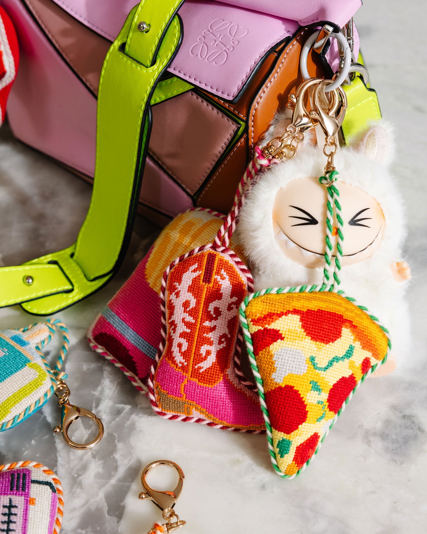 For the ones who know that accessories should never be boring. These needlepoint bag charms are for those who say, ‘Why blend in when you can carry a tiny taco?’ Whether it’s a taxi, a Stanley cup, or something cheeky, clip on your personality and let your bag do the talking.