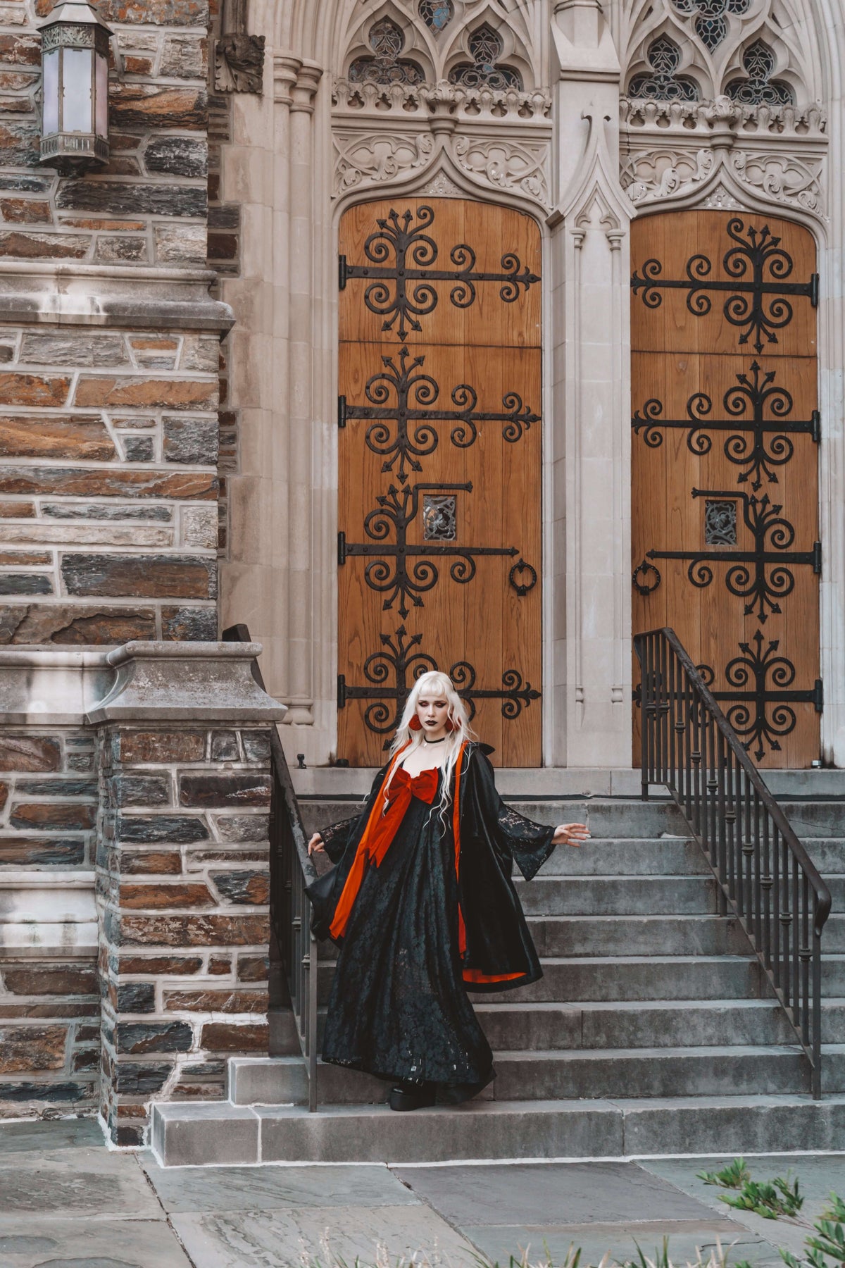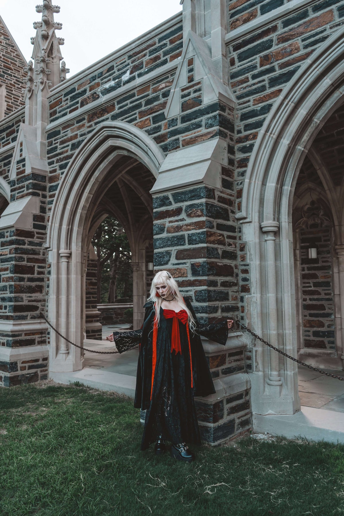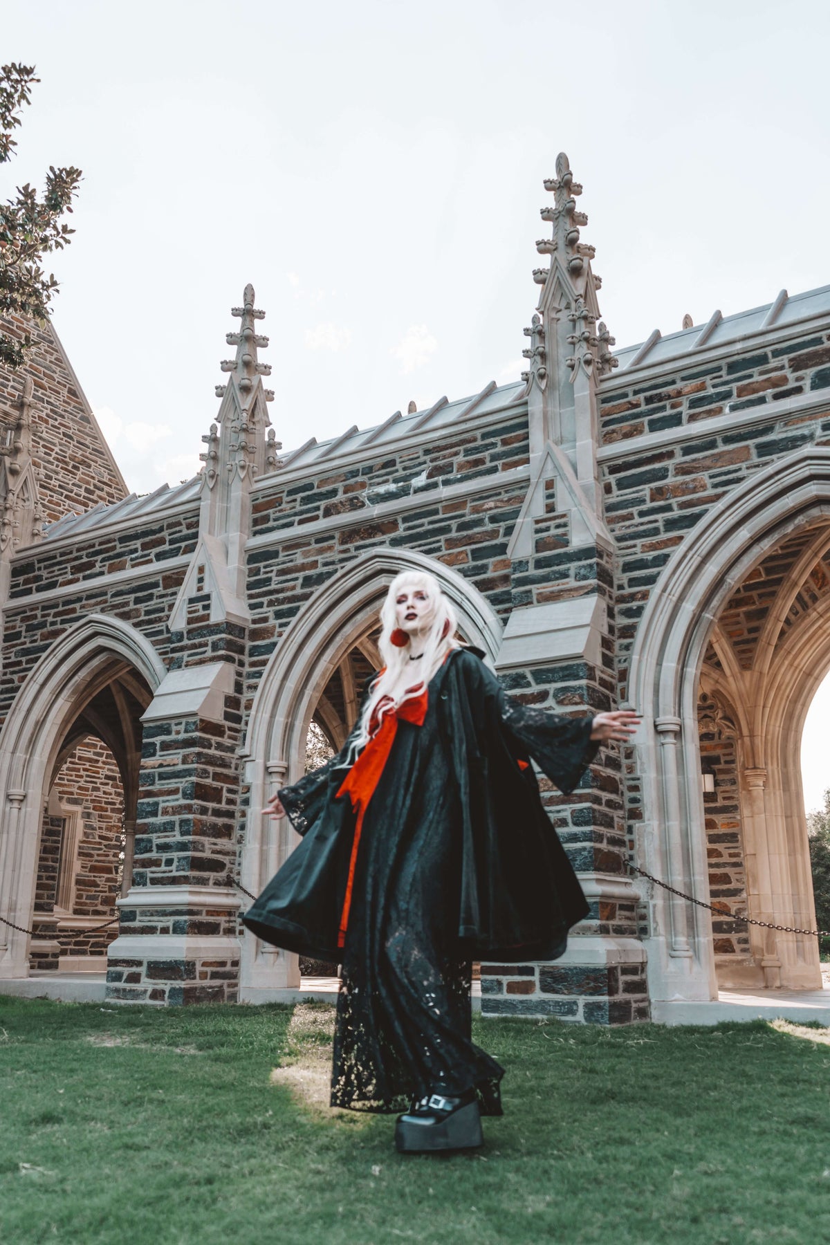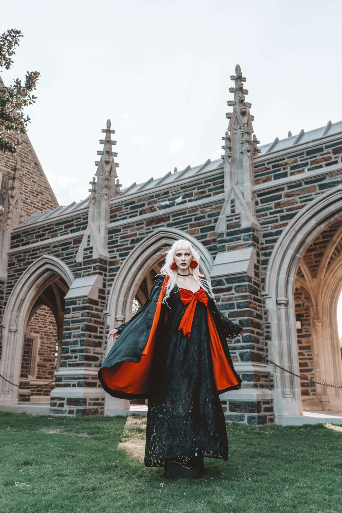 We HAD to bring the drama for the holidays with the new Priscilla Maxi! This gorgeous black dress features as black lace shell with bell sleeves and an empire waist, half lining, and interchangeable black and red velvet bows!