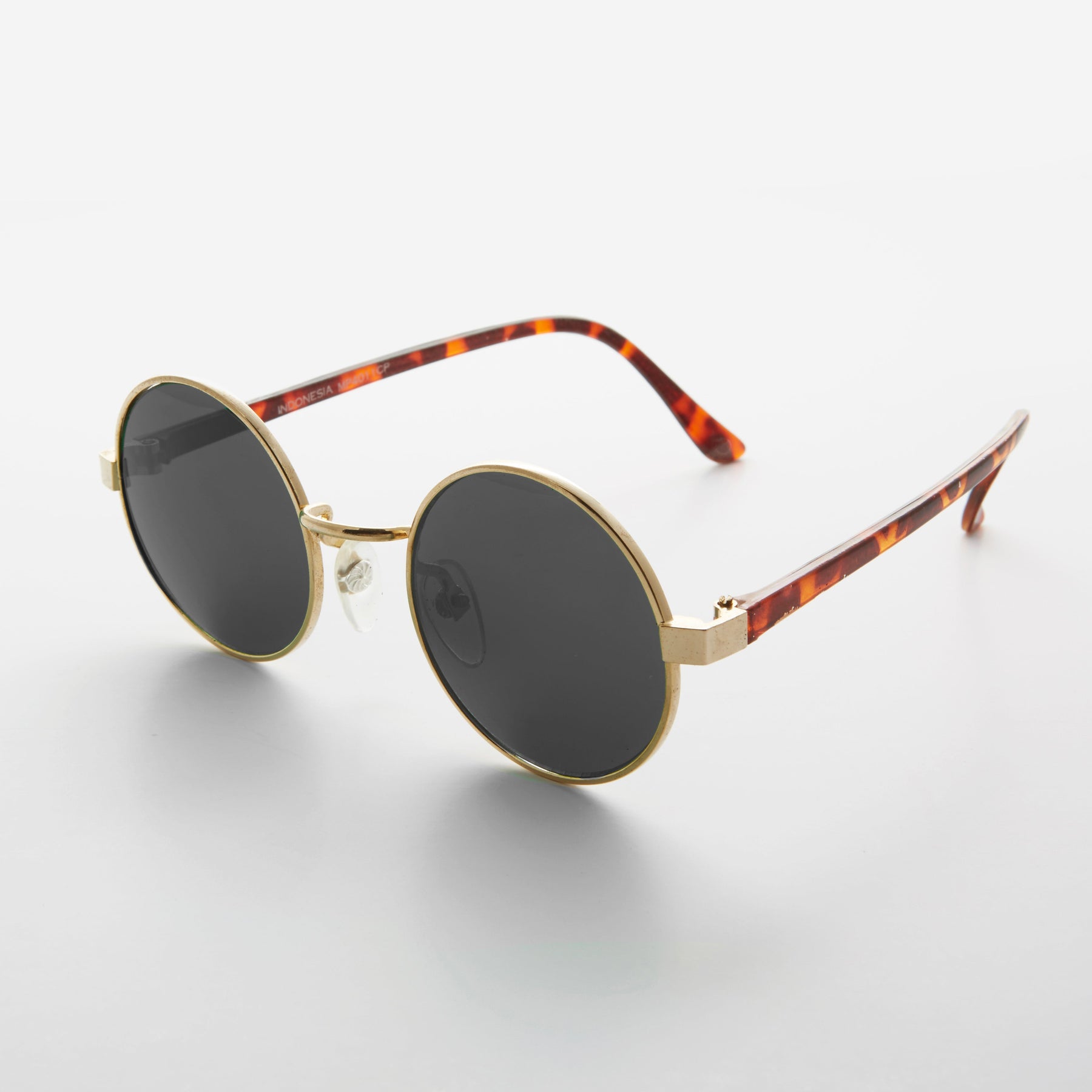 This small round sunglass, has tortoise temples and metal rims.
