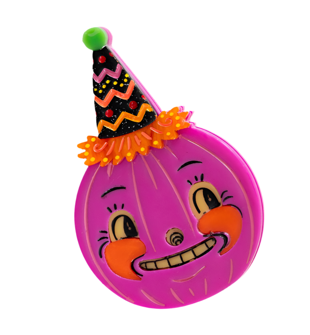 Add a burst of playful color to your Halloween wardrobe with the Jackie Plum Brooch, designed by Johanna Parker and brought to life by Lipstick & Chrome. This quirky magenta pumpkin wears a festive party hat trimmed with bright orange ruffles, capturing Johannaās signature mix of whimsy, nostalgia, and Halloween magic.