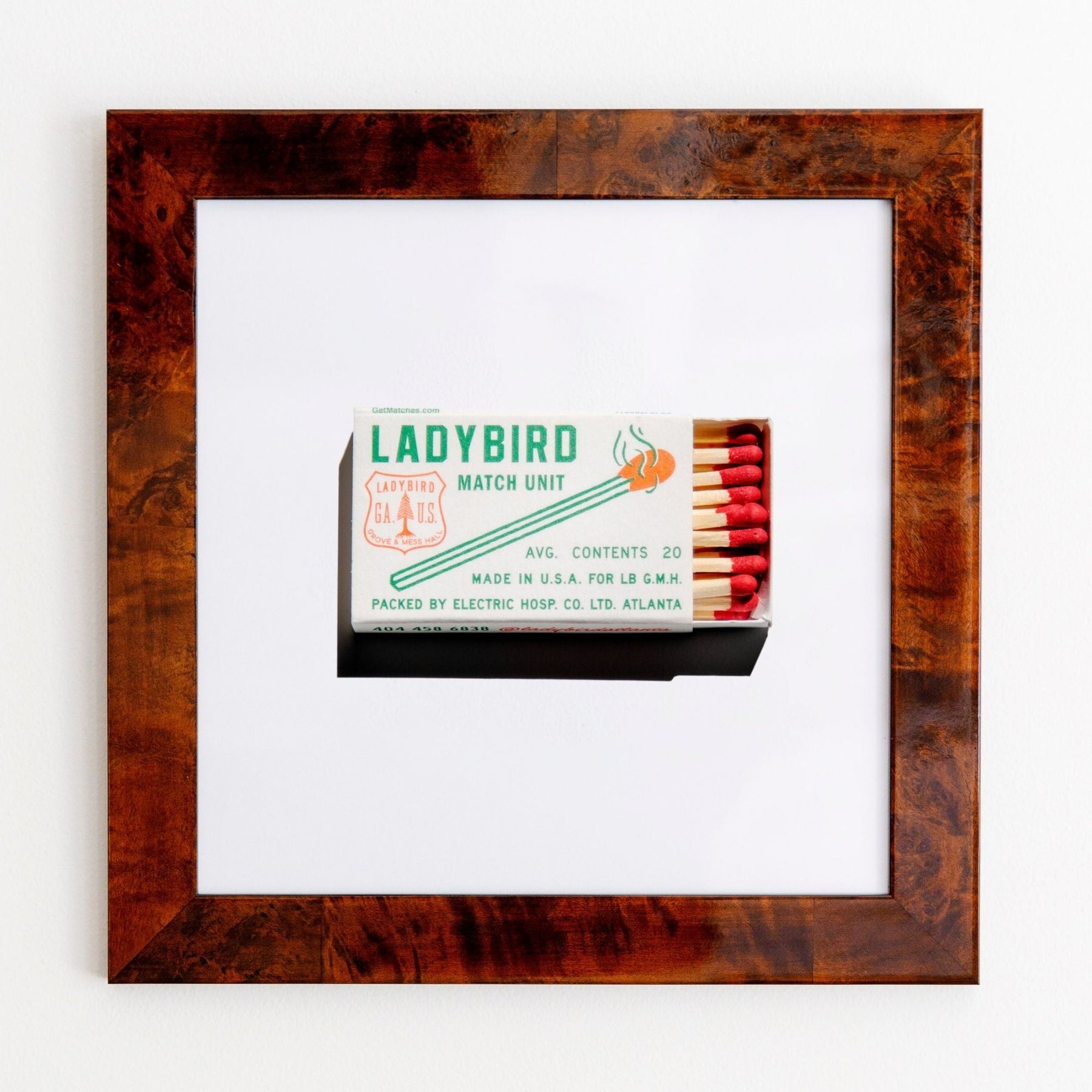 The LadyBird print showcases an iconic matchbook design.