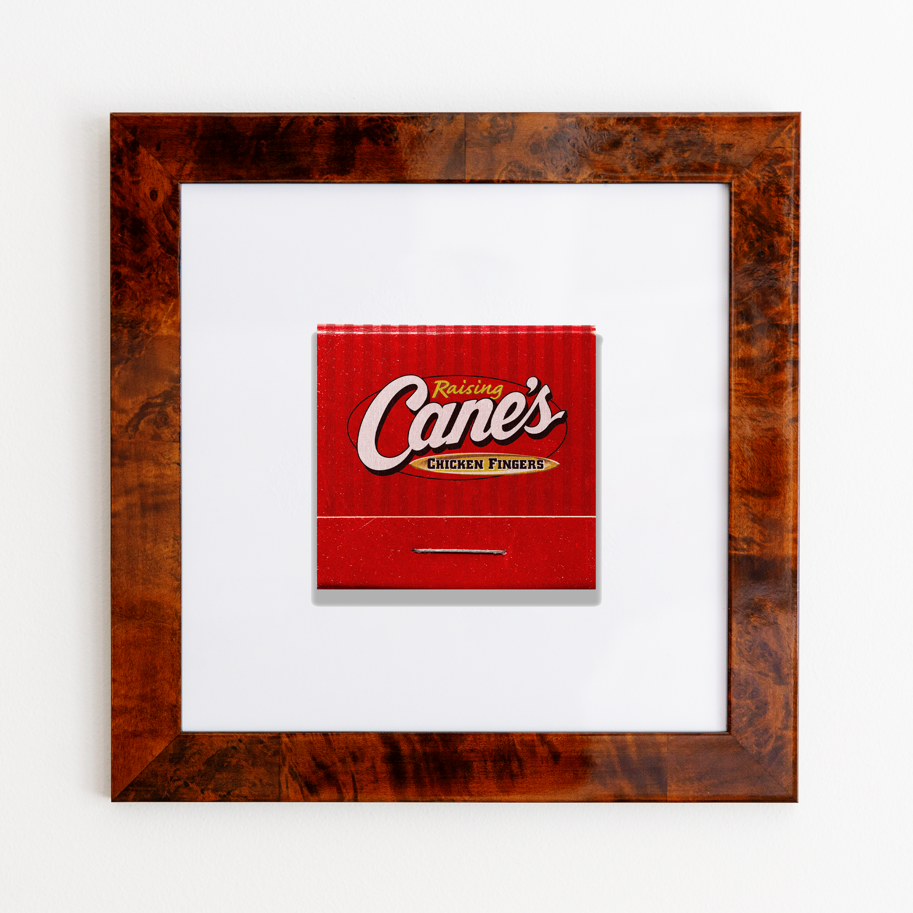 The Raising Cane's print showcases an iconic matchbook design.