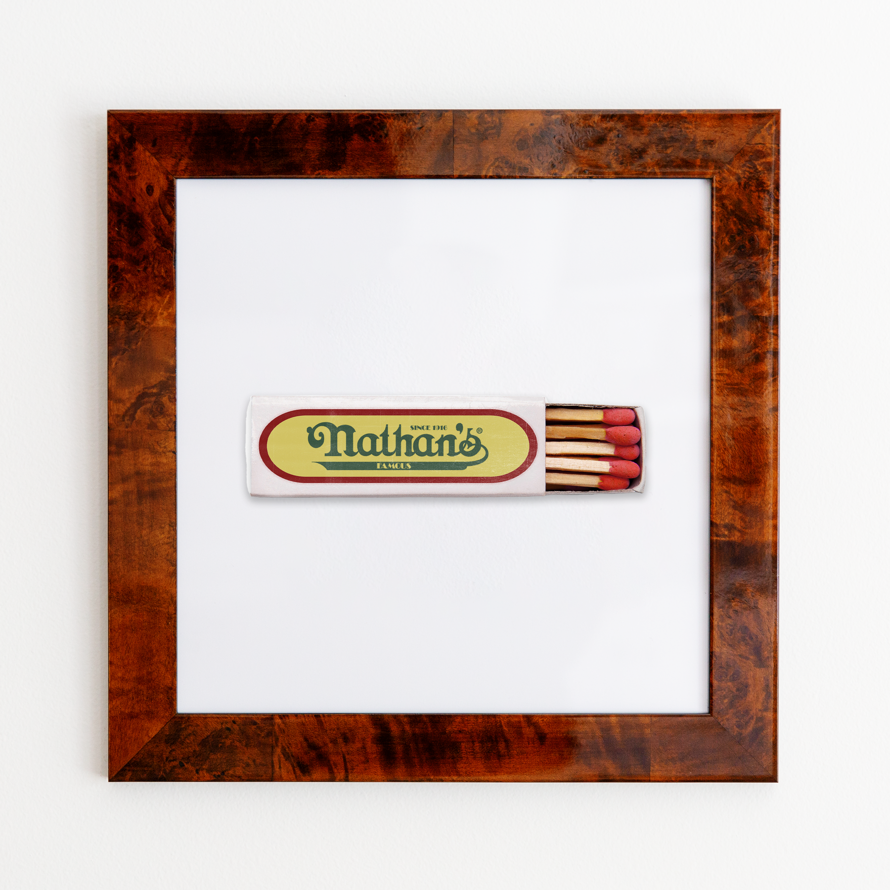 The Nathan's Hot Dogs print showcases an iconic matchbook design.