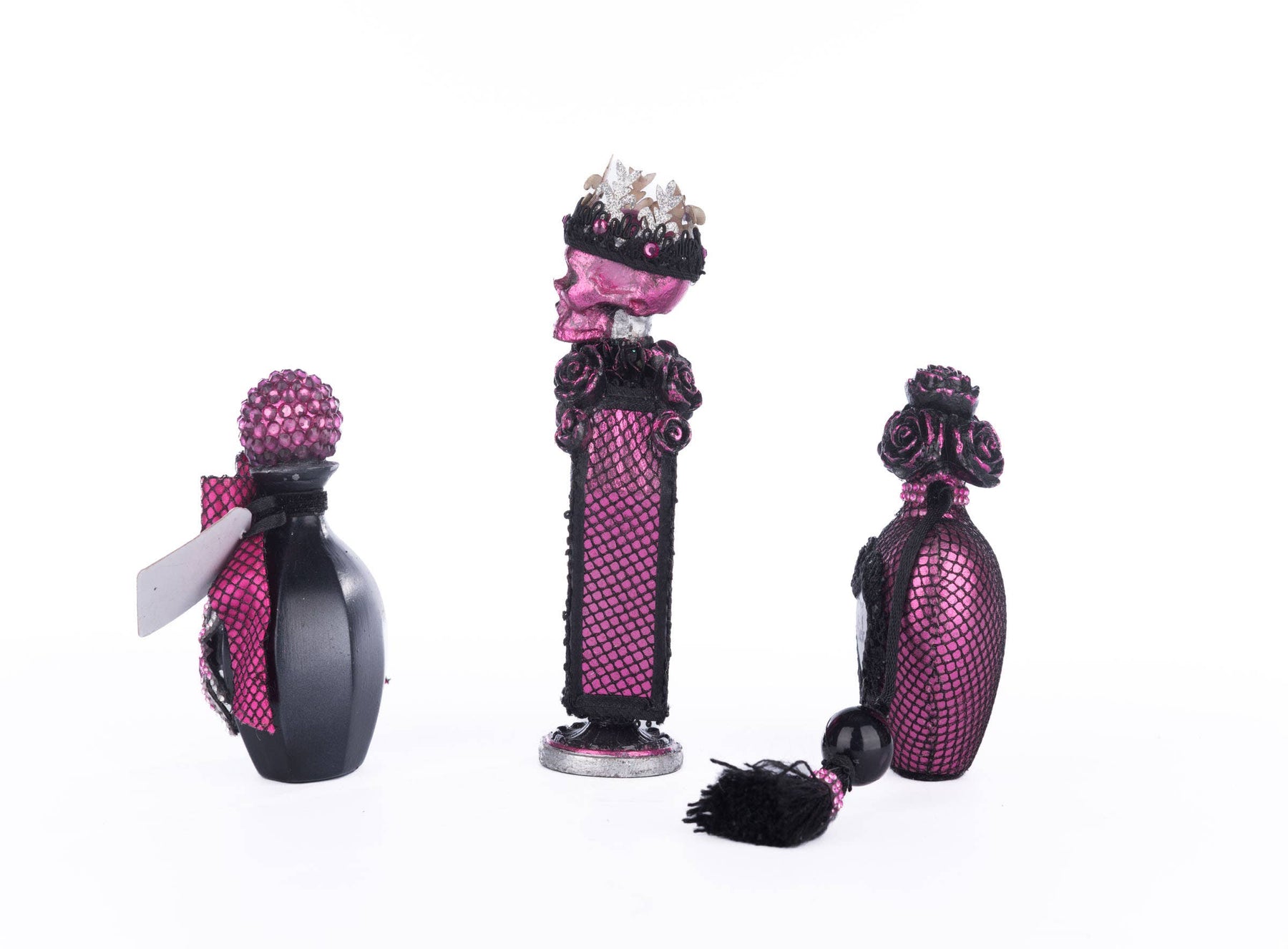 Get ready to cast a spell with this gorgeous set of 3 Vanity Potion Bottles by Katherine's Collection! These resin-sculpted bottles are adorned with pink and black hand-painted roses and skulls, adding a touch of spooky elegance to any beauty routine. Each piece is lovingly embellished by hand with jewels and trims, making them truly one-of-a-kind. Bottle dimensions are 3.5 x 1.5 x 7.25 inches. (Magic potions not included!)