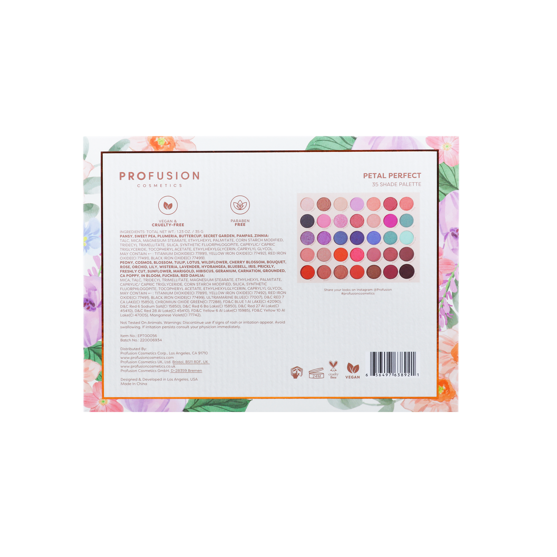Unleash your inner flower child with our Petal Perfect 35 Shade Palette! Whether you're going for a soft daytime look or a bold nighttime glam, this palette has you covered with its mix of matte, satin, shimmer, and metallic finishes. Our ultra-pigmented formula is buildable and blendable, so you can customize your look with ease. Infused with Vitamin E and free of parabens, this vegan and cruelty-free palette not only delivers on quality but is bursting with springtime vibes! Let your creativity blossom!