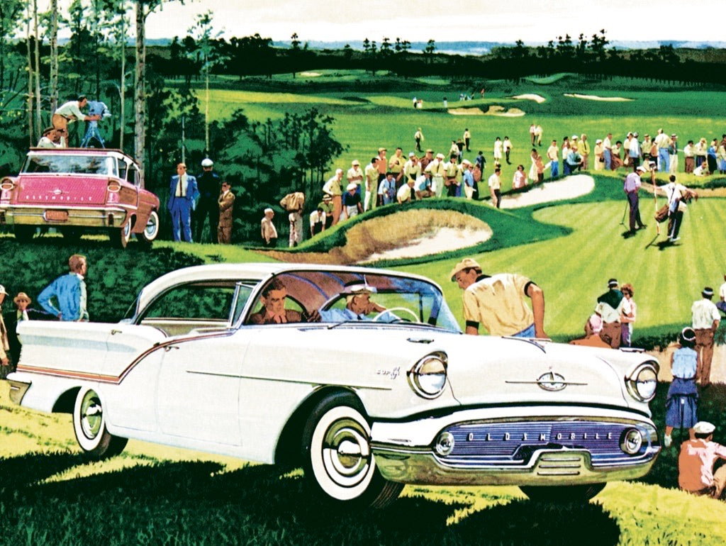 Seems like everyone in town has shown up for the local golf tournament. Roll up onto the green in style in your brand new 1957 Oldsmobile Super 88 in this jigsaw puzzle featuring a vintage car advertisement. Frame it once completed and you'll have a great piece of vintage art for your home.